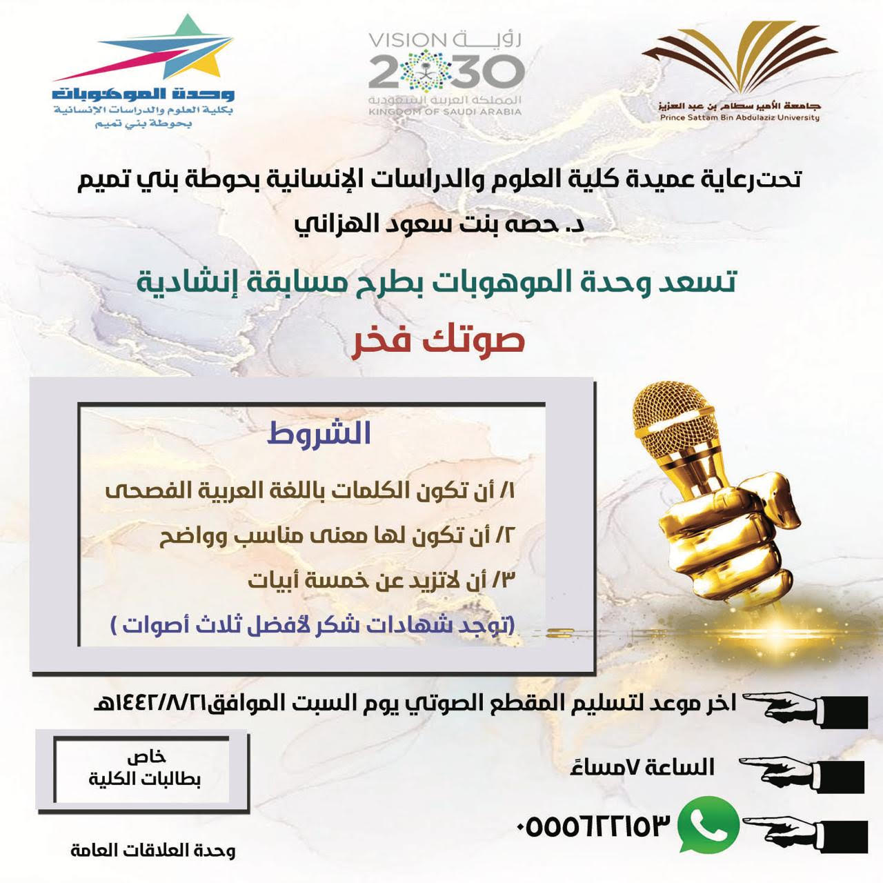 الأصوات الشجية كنز لا يستهان بها وثروة إنسانية يجب ألا تهدر، فمن هذا المنطلق و تحت رعاية عميدة كلية العلوم والدراسات الإنسانية بحوطة بني تميم د/حصة بنت سعود الهزاني، قدمت وحدة الموهوبات ممثلة برئيسة الوحدة والأستاذة/ منال الدحيم، مسابقة إنشادية بعنوان " صوتك فخر" وذلك في يوم الثلاثاء الموافق :1442/8/26هـ، بتمام الساعة السابعة مساءً.