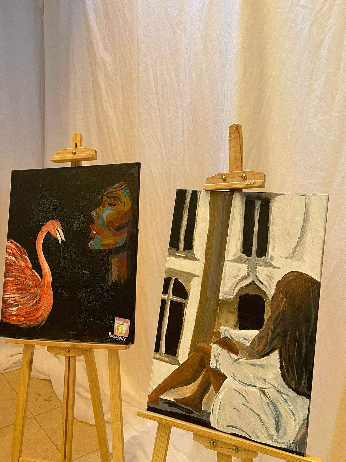 نلاحظ من خلال أعمال الطالبة مدى تأثرها ببعض لوحات الرسامين العالميين فكل رسام سواء كــان مبتدأ أو محترف يرسم لوحاته تأثراً بمدرسة فنية أو لفنان معين كما هو الحال في بعض أعمالها فهي متأثرة ببعض المدارس الحديثة كالمدرسة التكعيبية في اعتمادها على الأشكال الهندسية والخط الهندسي، أيضاً تأثرها بالمدرسة التأثيرية في استخدام العديد من النقاط الصغيرة من الألوان لإعطاء اللوحة إحساس أكبر بالحيوية عند رؤيتها من مسافة بعيدة، كما نلاحظ تأثرها بالفن التعبيري في التعبير عن المشاعر أو العواطف والحالات الذهنية التي تثيرها الأشياء أو الأحداث في النفس.
