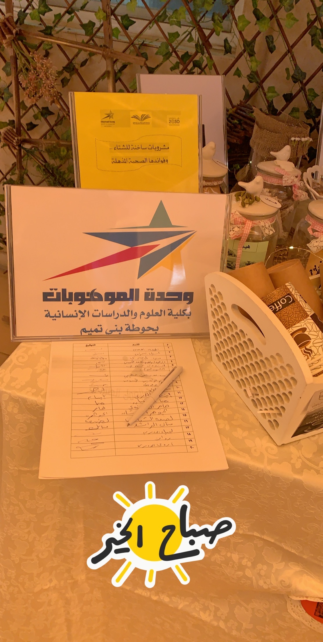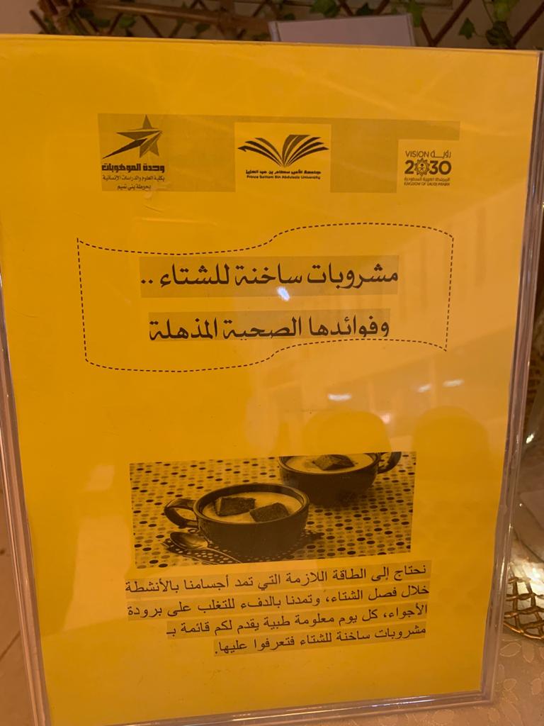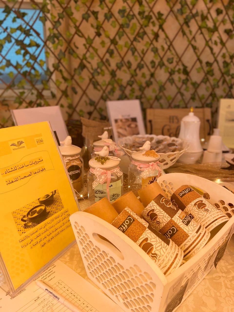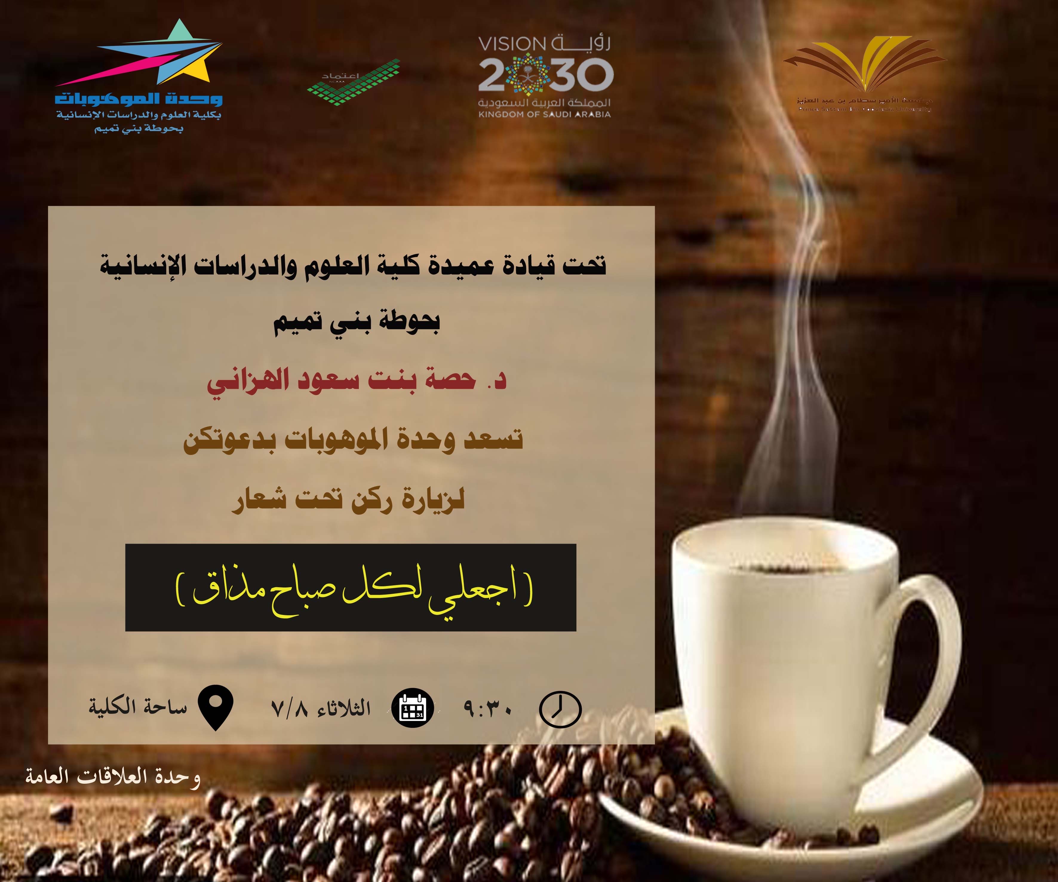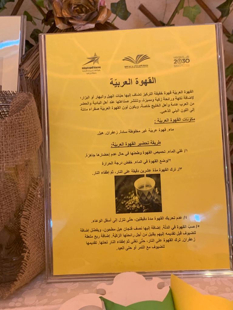 تعتبر القهوة رمز من رموز الصباح الجميل, لذا احببنا نحن وحدة الموهوبات بكلية العلوم والدراسات الإنسانية بحوطة بني تميم. أن نتشارك مع الجميع ارتشاف قهوة الصباح. عن طريق إقامة ركن تحت شعار( اجعلي لكل صباح مذاق) تحت قيادة عميدة الكلية د. حصة بنت سعود الهزاني، ومن تنفيذ الأستاذة ندى آل سعيد التميمي، وذلك في يوم الثلاثاء الموافق: 1441/7/8هـ. بساحة الكلية، ويهدف هذا الركن إلى إيجاد روح الأخوة والتفاهم والتعارف بين الطالبات بعضهن البعض ومنسوبات الجامعة، وتشجيعهن على إثراء معلوماتهن وتنمية حب الاستطلاع لديهن. اشتمل الركن على معلومات عن القهوة وأنواعها وفوائدها، والقيمة الغذائية لها وأضرارها. كما اهتمت ا/ ندى بتصميم ديكور جميل ومتواضع باللمسات الفنية التي تبرز جمال الركن. ولقد شهد هذا الركن حضور عميدة الكلية د. حصة الهزاني وبعض من منسوبات وطالبات الكلية، ولقد أبدو إعجابهن وتشجيعهن لمثل هذه الفكرة.