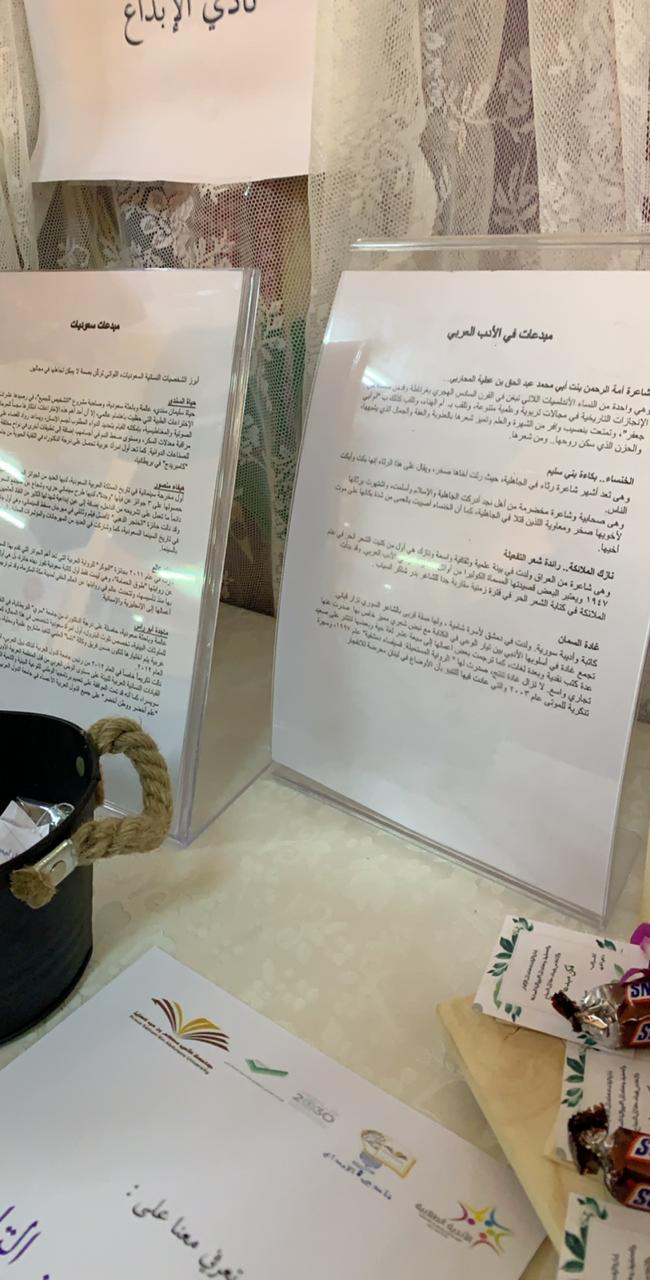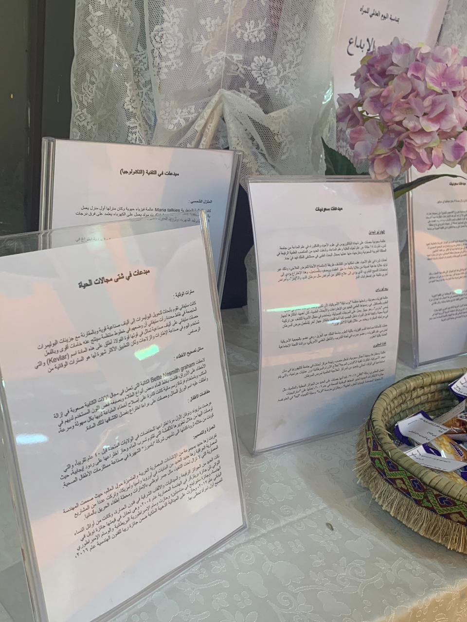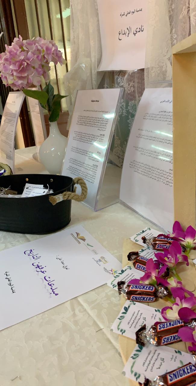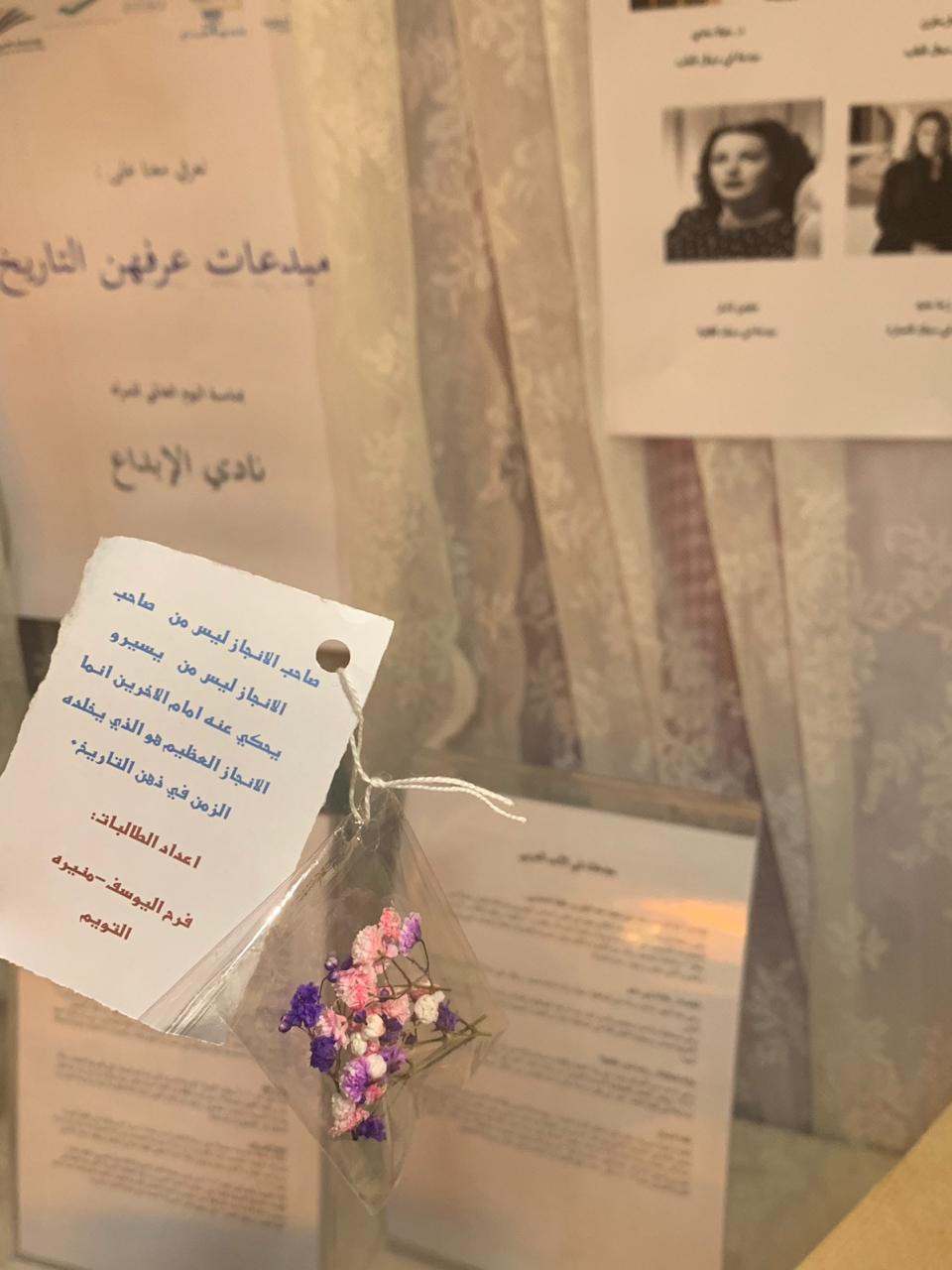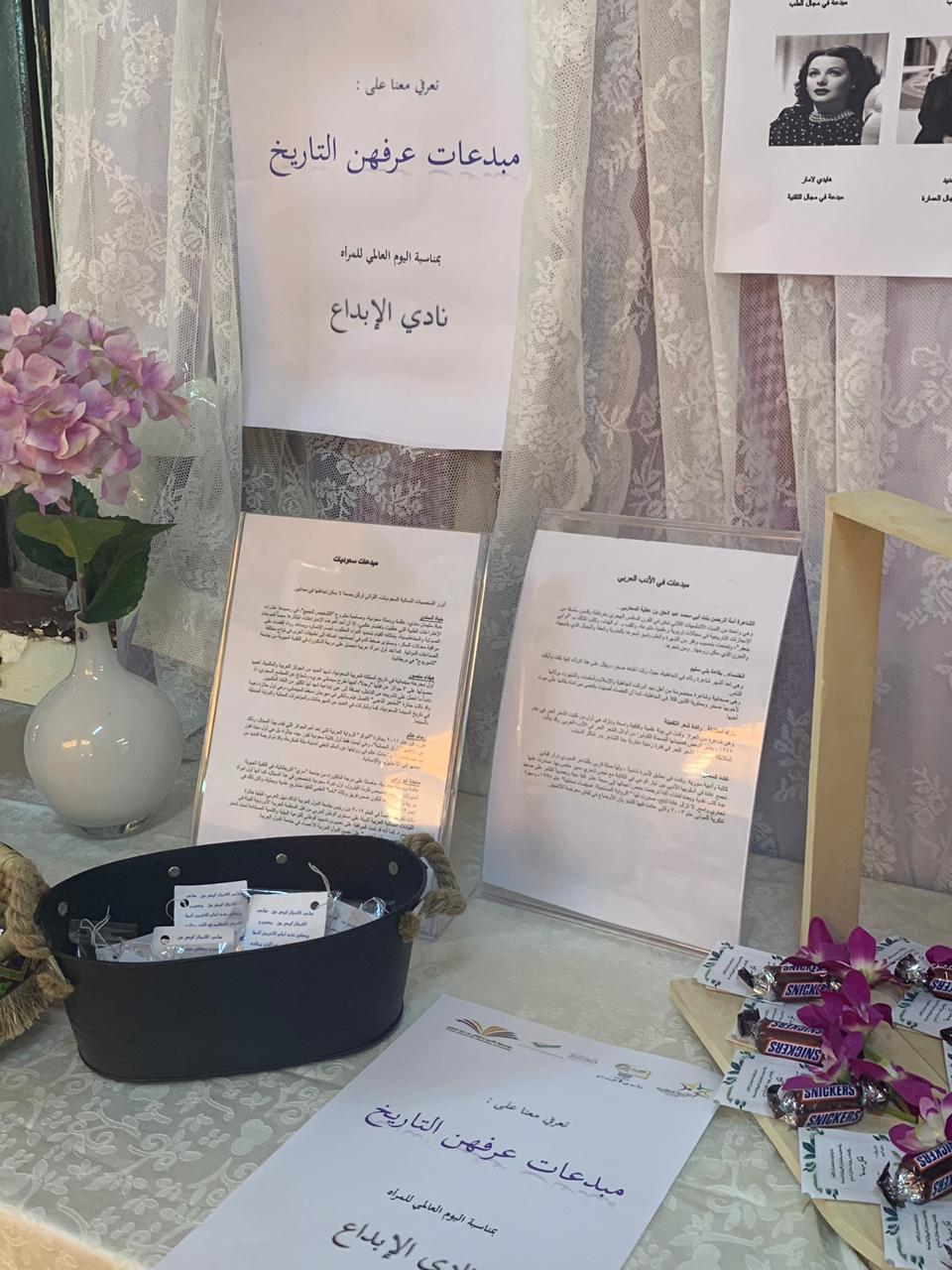 بمناسبة اليوم العالمي للمرأة، أقام نادي الإبداع بكلية العلوم والدراسات الانسانية بحوطة بني تميم. ركن تعريفي بعنوان (مبدعات عرفهن التاريخ ) تحت قيادة عميدة الكلية د/ حصة سعود الهزاني، وبرئاسة الأستاذة/ نهى الحربي، وذلك في يوم الثلاثاء الموافق: 1441/7/8هـ. حيث تعرفت من خلاله الطالبات على أهم المبدعات اللاتي سطرن أسماءهن في أفق الإبداع والتي تشمل الأدب والطب والكيمياء وشتى مجالات الحياة المختلفة . كما كان هناك نبذة مصغره عن أهم المبدعات السعوديات اللواتي عرفهن العالم من خلال إبداعهن في المجالات العلمية والأدبية المختلفة. كما تم توزيع بعض العبارات التحفيزية للطالبات والتي تحث على الثقة بالنفس والإبداع والعمل في المجالات التي يبدعن فيها.