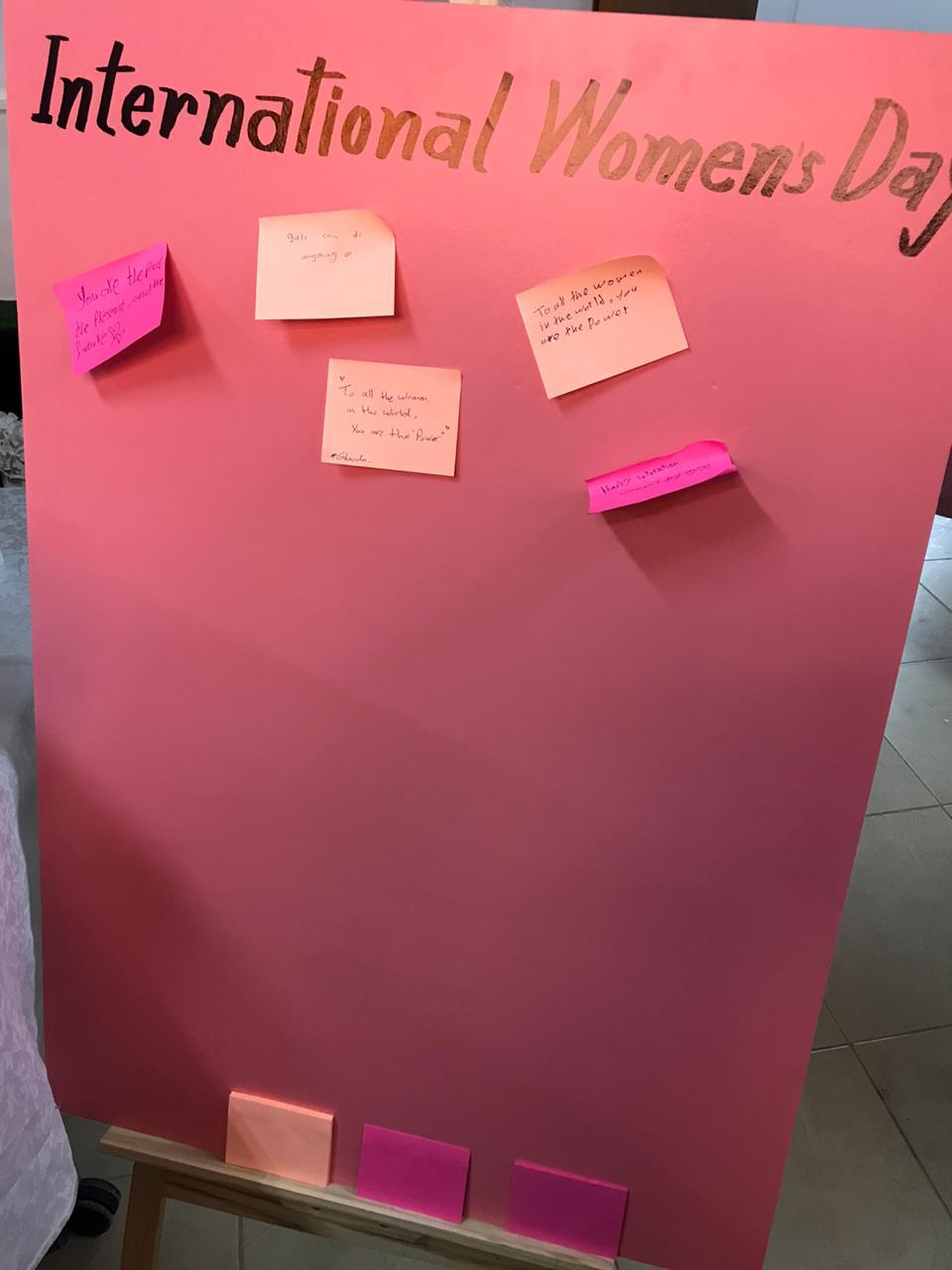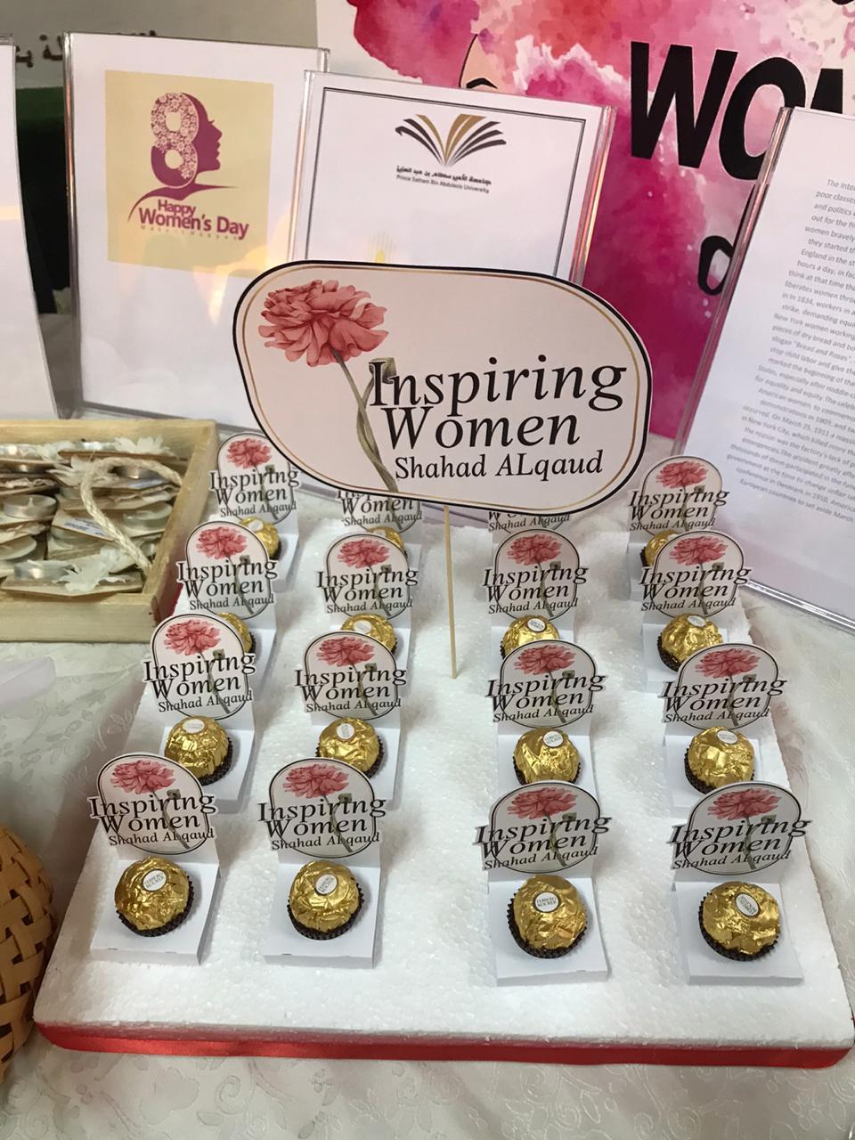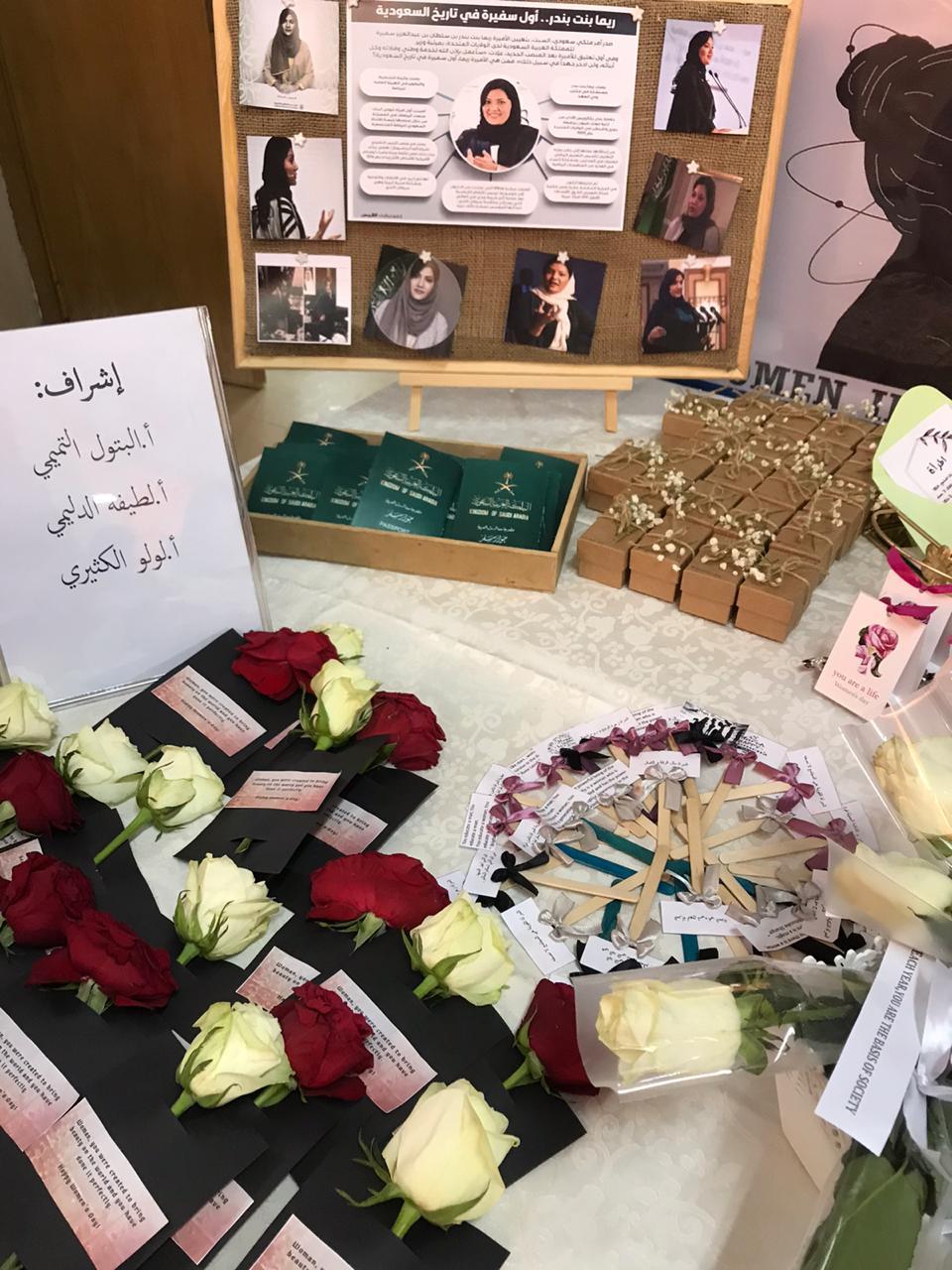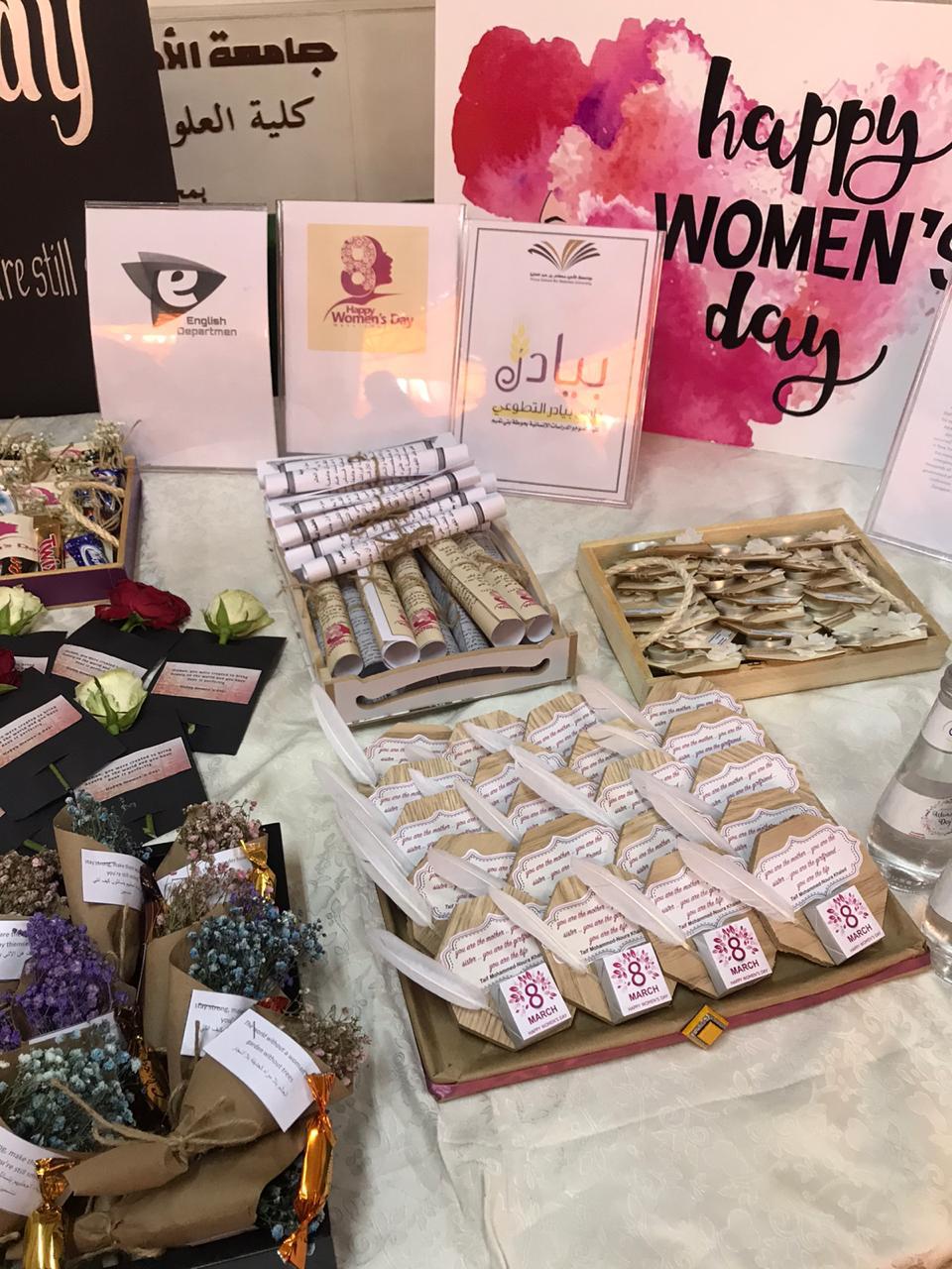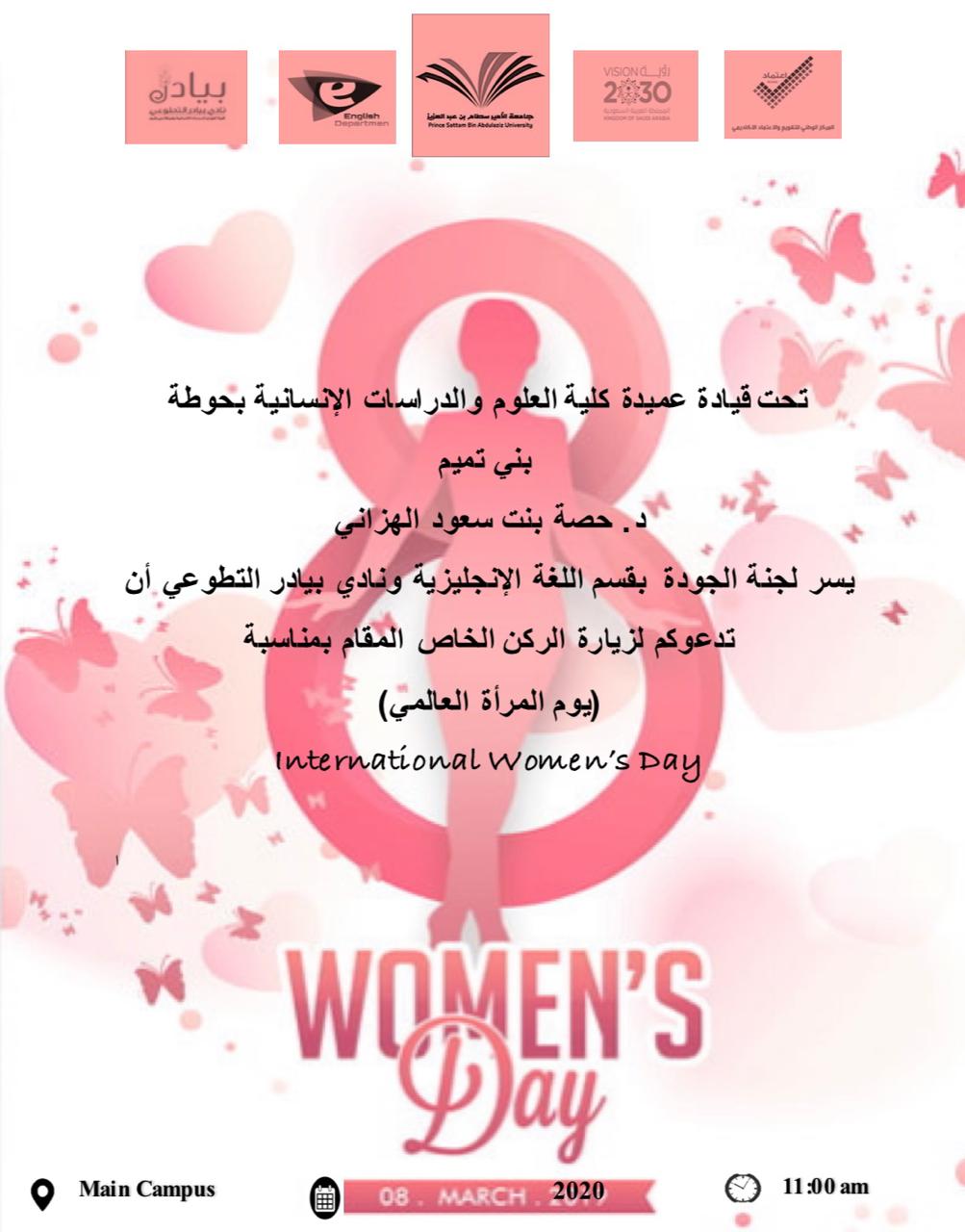 انطلاقاً من رسالة الجامعة ٢٠٣٠ و إيماناً منها بالدور الإيجابي للمرأة ومكانتها في صنع المجتمع تربويًا وقياديًا واجتماعيًا، وتحت قيادة عميدة كلية العلوم والدراسات الإنسانية بحوطة بني تميم د. حصة بنت سعود الهزاني، نظّمت لجنة الجودة بقسم اللغة الإنجليزية ونادي بيادر التطوعي وبإشراف كلاً من أ.لولوه الكثيري أ. البتول التيميمي أ. لطيفة الدليمي احتفالاً (بيوم المرأة العالمي ) وذلك في يوم الأحد الموافق : ١٣/ ٧/ ١٤٤١هـ. تضمن ركنًا مميزًا في البهو الرئيسي احتوى على عدة مشاركات مبدعه تمثلت في( توزيعات- نشرات - عبارات ملهمه- نساء ملهمات- اهداءات - ورد للزوار - لوحة لكتابة العبارات - تطبيقات ( باركود لإرسال رسائل محفزة للمرأة) حظي الركن بعدد كبير من الزوار وقد لاقت الفعالية استحسان الجميع.