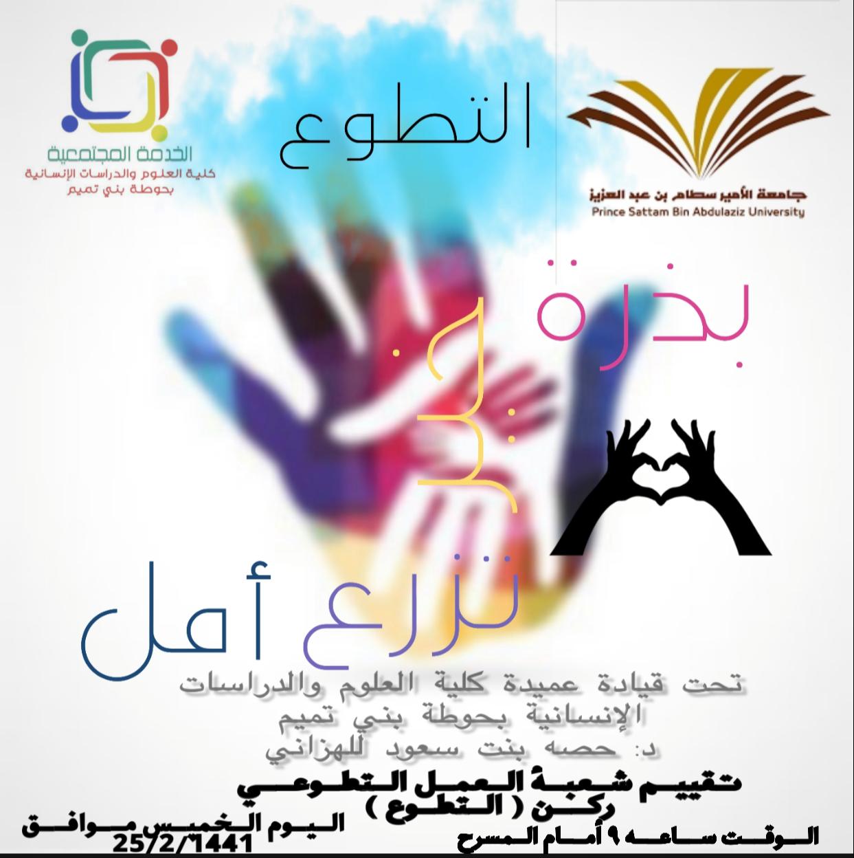 تسعى كلية العلوم والدراسات الإنسانية بحوطة بني تميم بقيادة سعادة عميدة الكلية د/حصة بنت سعود الهزانى إلى زرع قيمة التطوع لدى الطالبات وتكوين فريق تطوعي لخدمة أفراد المجتمع في جميع المجالات ومن هذا المنطلق نظمت شعبة العمل التطوعي بوحدة النشاط الطلابي ركن تعريفي يوضح مجالات العمل التطوعي وأهدافه ، وذلك يوم الخميس الموافق :١٤٤١/٢/٢٥هـ وقد استقطب الركن عدد من الطالبات الراغبات للانضمام إلى الشعبة كما تم تسجيلهن بالشعبة.