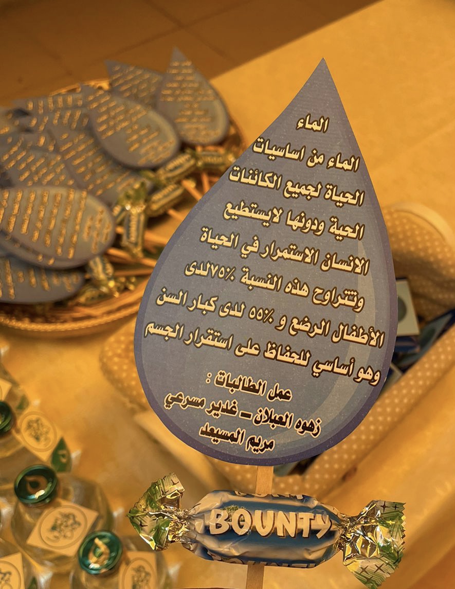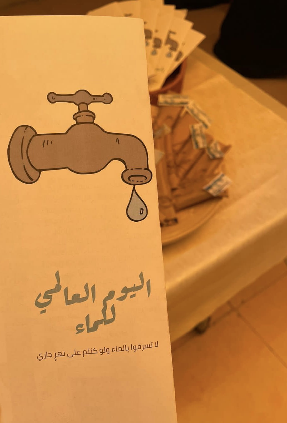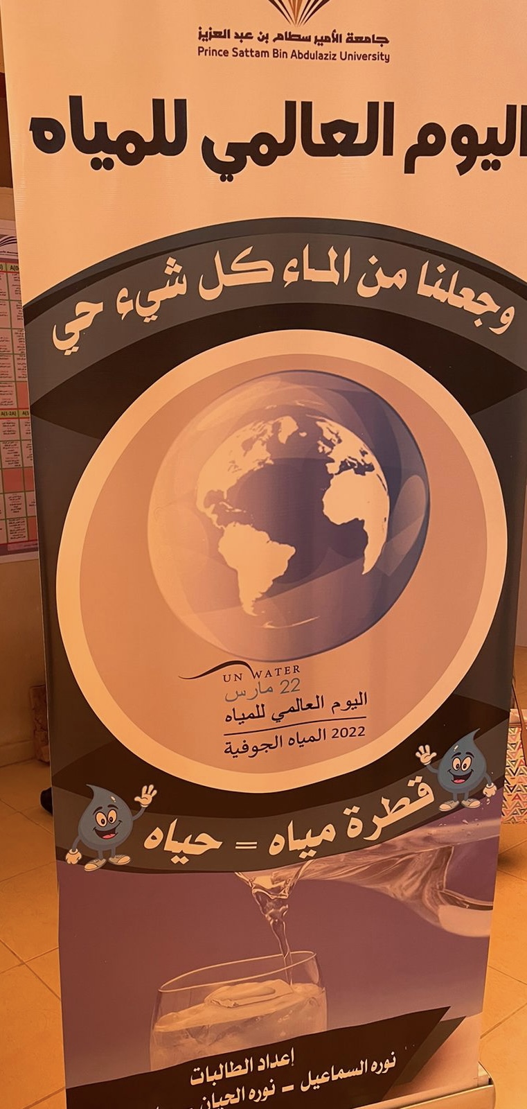 يأتي اليوم العالمي للمياه في اليوم الثاني والعشرين من شهر آذار من كل سنة، ويتمّ الاحتفال فيه، وإيمانًا بأهميته أقامت وحدة التدريب والخدمة المجتمعية بقسم الرياضيات تحت رعاية عميدة كلية العلوم والدراسات الإنسانية بحوطة بني تميم د/حصة بنت سعود الهزاني "ركنًا بمناسبة اليوم العالمي للمياه" بإشراف د/ أميرة صالح وأ/ أمل آل عبد الله ومشاركة طالبات قسم نظم المعلومات، وذلك في يوم الثلاثاء الموافق: 1443/8/19هـ بساحة الكلية.