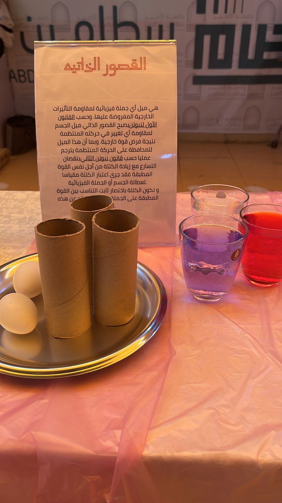 تحت رعاية عميدة كلية العلوم والدراسات الإنسانية بحوطة بني تميم د. حصة بنت سعود الهزاني أقامت طالبات قسم الكيمياء ركنًا بعنوان (الفيزياء في حياتنا). وذلك في يوم الأثنين الموافق 1445/4/8 هـ في بهو الكلية.