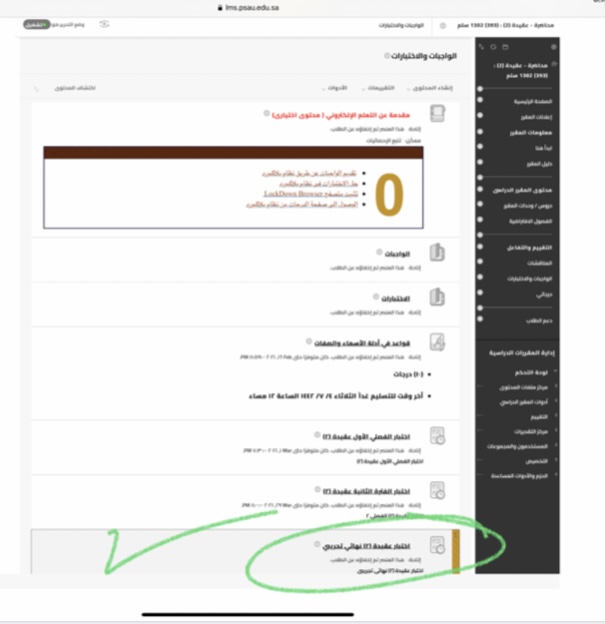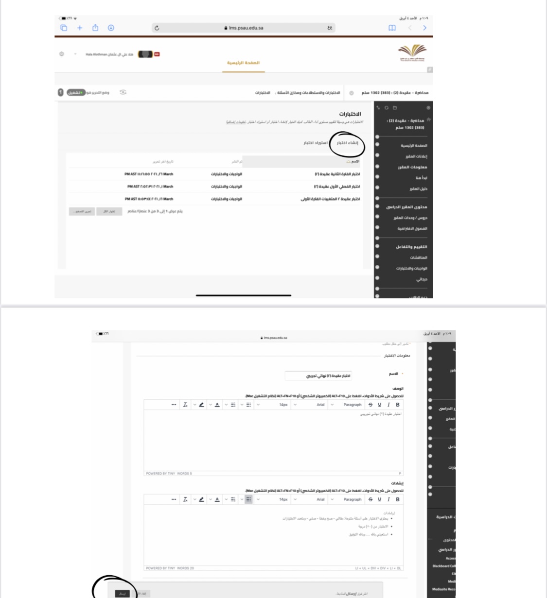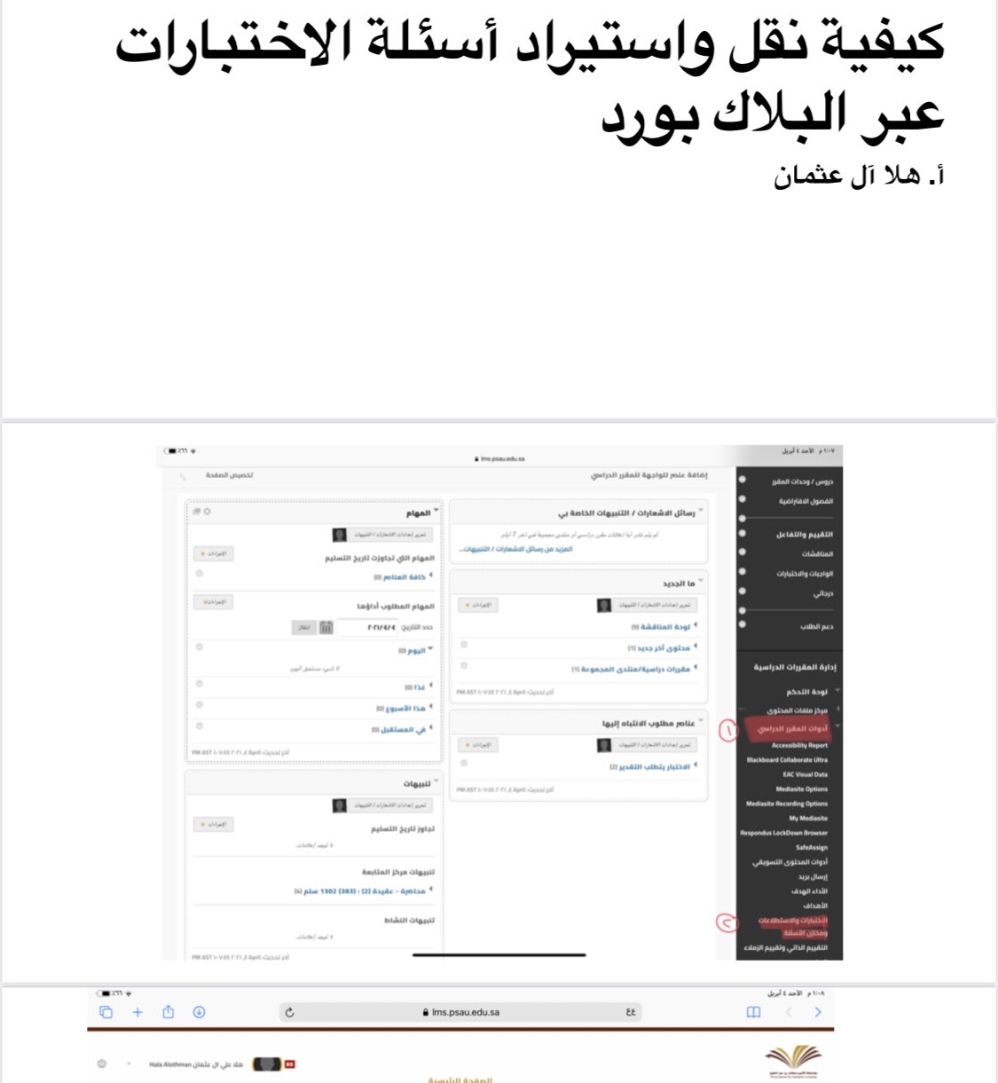 تحرص حكومة المملكة العربية السعودية على استمرار العملية التعليمية فقد تم اعتماد أنظمة تعليمية حديثة عن بعد ومنها نظام البلاك بورد، حيث أقام قسم الدراسات الإسلامية تحت رعاية عميدة كلية العلوم والدراسات الإنسانية بحوطة بني تميم الدكتورة/ حصة بنت سعود الهزاني ورشة بعنوان "كيفية نقل واستيراد أسئلة الاختبارات عبر البلاك بورد" وذلك في يوم الثلاثاء الموافق: 1442/8/24هـ، في تمام الساعة الرابعة مساءً، عبر برنامج البلاك بورد.