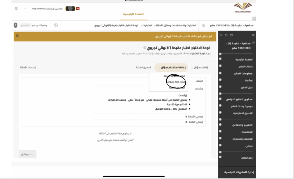 قدمت الورشة الأستاذة: هلا آل عثمان، وقد تناولت عدة موضوعات مهمة منها كيفية كتابة مخازن أسئلة، وإنشاء كتل عشوائية للاختبار، وتقسيم الدرجات على أنواع الأسئلة ثم شرح محور الورشة وهو كيفية نقل الأسئلة للشعب الأخرى بطريقة متكاملة ومختصرة، وتم الإجابة على التساؤلات والمشكلات التي تواجه عضو هيئة التدريس في إنشاء الاختبارات.