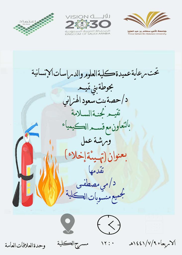 تسعى كلية العلوم والدراسات الإنسانية بقيادة عميدة الكلية الدكتورة / حصة بنت سعود الهزاني إلى التوعية بأهمية الأمن والسلامة وغرس مبادئ الوقاية لدى الموظفات والطالبات داخل الكلية . ومن هذا المنطلق أقامت لجنة السلامة بالكلية بالتعاون مع قسم الكيمياء ورشة بعنوان "تهيئة إخلاء “وذلك في يوم الأربعاء الموافق: 1441/7/9هـ في تمام الساعة 12:30. أقامتها د / مي مصطفى أحمد مساعدة العميدة للشؤون التعليمية والاكاديمية و رئيسة لجنة السلامة. تهدف الورشة إلى تدريب المجموعات المشاركة على عملية الإخلاء السريعة بمباني الكلية والأدوار المحددة لها. التعرف على مخططات مباني الكلية وتوزيع المجموعات. حضرت الورشة عدد من الإداريات و مجموعة من عضوات هيئة التدريس و في ختام الورشة تمت الإجابة على استفسارات الحاضرات.