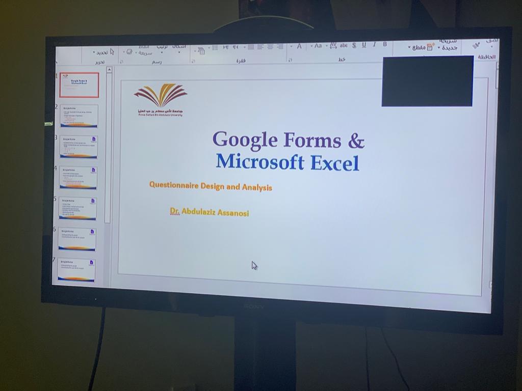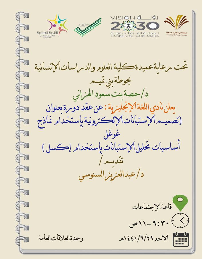 نظم نادي اللغة الإنجليزية بكلية العلوم و الدراسات الإنسانية بحوطة بني تميم، ورشة بعنوان " تصميم الاستبيانات الالكترونية باستخدام نماذج غوغل و تحليل الاستبيانات باستخدام إكسل" وذلك في يوم الأحد الموافق: ١٤٤١/٦/٢٩هـ. في قاعه التدريب. تحت قيادة عميدة الكلية الدكتورة/ حصة بنت سعود الهزاني. ومن تقديم الدكتور/ عبد العزيز السنوسي. و قامت المحاور الأساسية في الورشة على تقديم الخطوات الأساسية لتصميم الاستبيانات الإلكترونية لأغراض البحث العلمي باستخدام موقع غوغل. كما تم توضيح آلية نشر الاستبيانات و توزيعها إلكترونياً .أيضاً تم تقديم طريقه عملية لاستخدام برنامج إكسل في تحليل الاستبيانات لأغراض البحث العلمي.