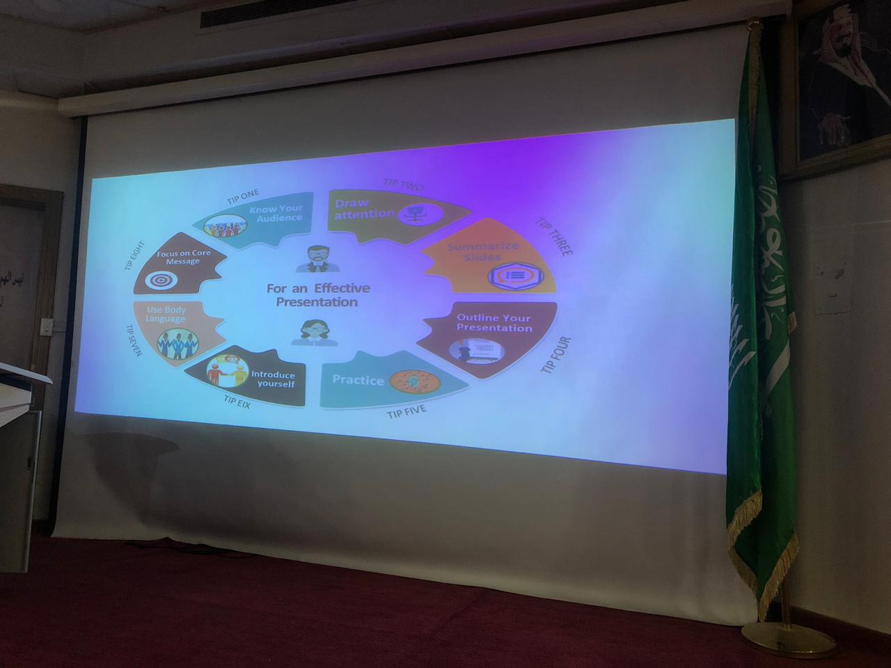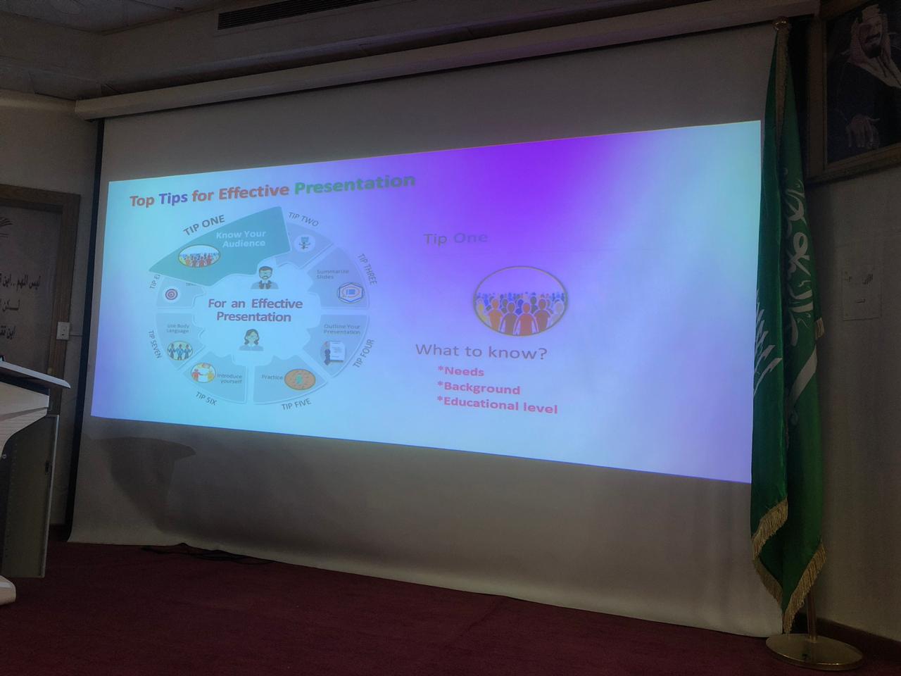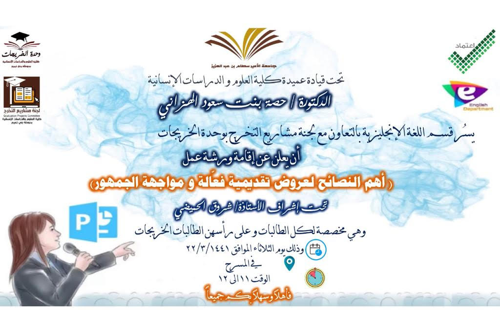 في إطار تهيئة طالبات مشاريع التخرج لإعداد العروض التقديمية الفعالة، و التغلب على رهبة مواجهة الجمهور ممثلاً في لجان مناقشة و تقييم مشاريع التخرج. في ظل قيادة عميدة كلية العلوم و الدراسات الإنسانية بحوطة بني تميم د. حصة بنت سعود الهزاني ، قدمت أ/ شروق الحميضي المحاضر بقسم اللغة الإنجليزية بالتعاون مع لجنة مشاريع التخرج بوحدة الخريجات ورشة عمل بعنوان " أهم النصائح لعروض تقديمية فعالة و مواجهة الجمهور" يوم الأربعاء الموافق:1441/3/30هـ بمسرح الكلية و بحضور (39) طالبة من طالبات مشاريع التخرج من عدة أقسام منها قسم نظم المعلومات و اللغة الإنجليزية و الكيمياء و الرياضيات. بدأت الورشة بإلقاء الضوء على أهمية تصميم العروض التقديمية بشكل احترافي، و تأثيرها الإيجابي على تقييم الجمهور لموضوع العرض. ركزت على الدعائم الأساسية التي يجب توافرها لإنتاج عرض تقديمي مهني فعال ممثلة في ثمان نصائح رئيسية تشمل التعرف على الجمهور قبل إعداد العرض و خلفياته المعرفية و المعلومات التي يتوقع الحصول عليها من العرض حتى يتسنى جذب انتباهه بالتركيز على النقاط الأكثر أهمية من خلال تلخيص الشرائح المقدمة بشكل هادف قائم على تحديد الإطار الذي يتضمنه العرض وفقاً للخطة التي سبقت التنفيذ. كما تم التوجيه إلى ضرورة التدريب المتكرر على إلقاء العرض قبل مواجهة الجمهور إما بشكل شخصي أو بالاستعانة بالزميلات لتلقي ردود الأفعال لتلافي الأخطاء و تحسين العرض. علاوة على أهمية الاستخدام الفعال لنبرة الصوت و حركة العين و لغة الجسد إضافة إلى مهارات التعريف بالنفس التي تعكس الاتزان و الثقة و المعرفة التامة بجوانب موضوع العرض و العمل بروح الفريق بين أفراد المجموعة. و اختتمت الورشة بتوزيع أوراق عمل على الطالبات لتسجيل أبرز المهارات و الاستراتيجيات الفعالة التي تم الاستفادة منها للتطبيق على العروض التقديمية لمشاريع تخرجهن. و قد أبدت الطالبات تفاعل كبير و إعجاب شديد بأسلوب المحاضر و محتوى الورشة.