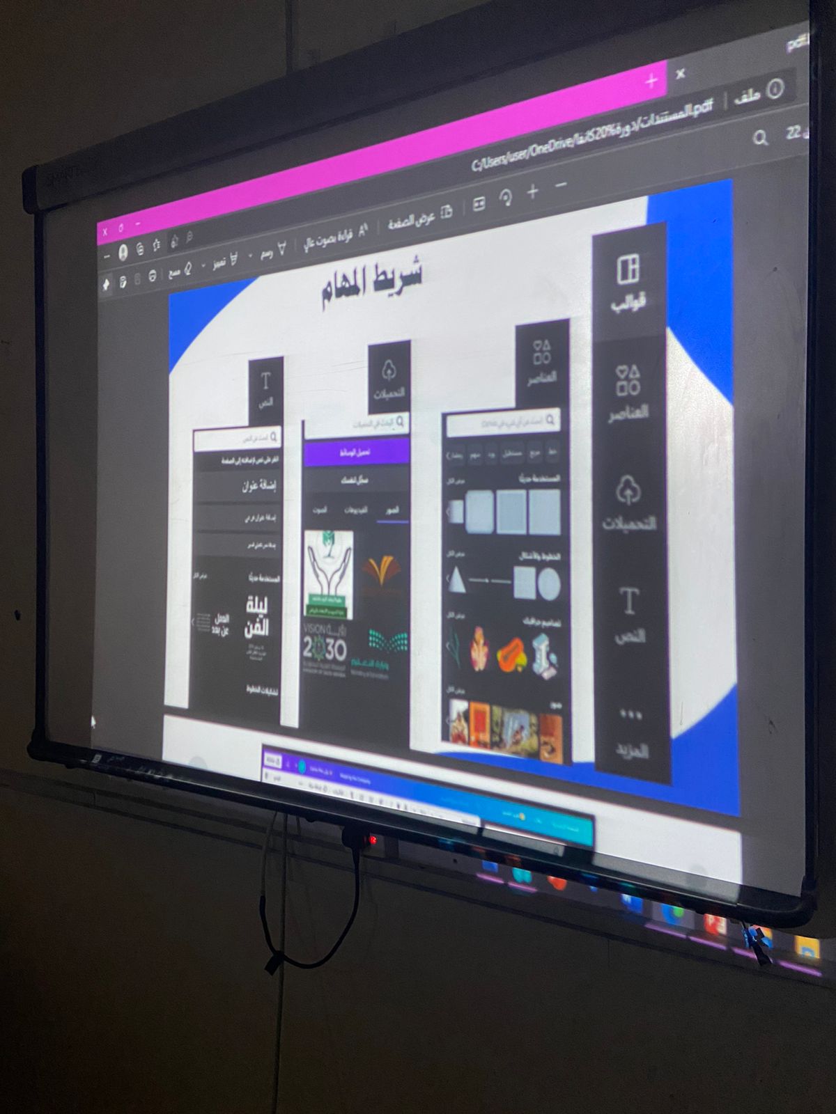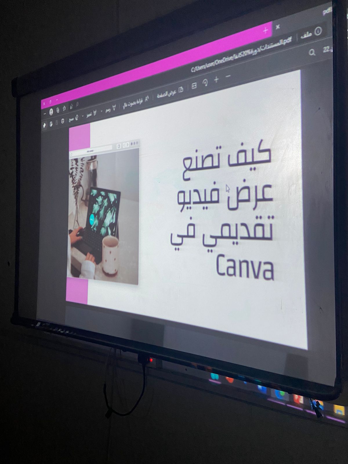 في بداية الورشة تم توضيح مقدمة بسيطة عن التصميم عناصر التصميم حيث يمثل الأساسيات التي يستخدمها المصمم مثل (اللون، الشكل، الحجم، الخط ،...) ثم التعريف ببرنامج Canva باعتباره من أهم وأفضل البرامج التي تتيح للمستخدمين التصميم من خلاله بمختلف أنواع التصاميم ويتميز بسهولة استخدامه وتوفير الكثير من القوالب الجاهزة للاستخدام والتعديل عليها وتوفير تطبيق خاص بالبرنامج لكل من هواتف (الأندرويد Android وIOS ) وكذلك شرح لخطوات استخدام البرنامج وطريقة استخدام القوالب الجاهزة والتعديل عليها وكيفية صنع فيديو وإضافة مؤثرات عليه، هدفت هذه الورشة إلى تبسيط مفهوم التصميم لدى المتدربات وتكوين خلفية عن التغذية البصرية.