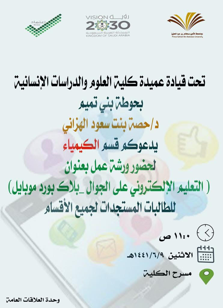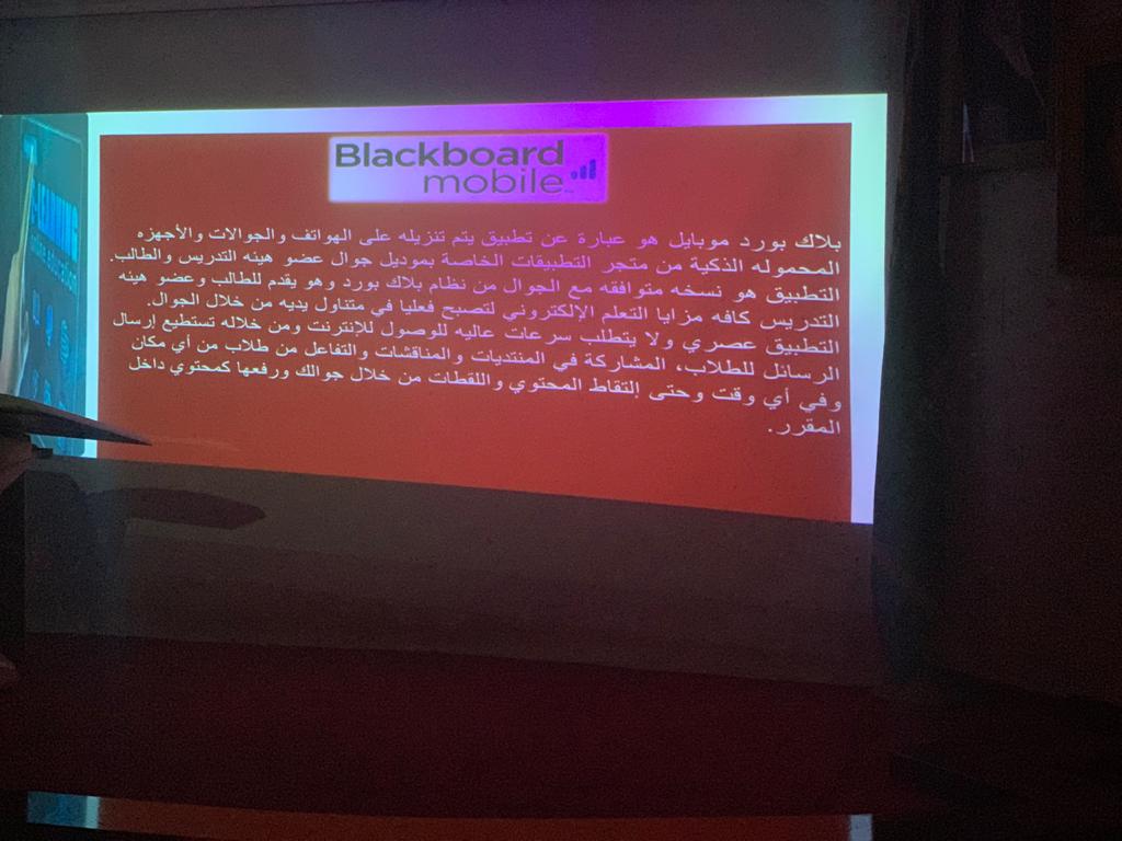 يُعد نظام البلاك بورد (Black board) من الوسائل العلمية و الإلكترونية التي تدعم العملية التعليمية. وعلى هذا الأساس أقامت وحدة التعليم الإلكتروني بالتعاون مع قسم الكيمياء بكلية العلوم والدراسات الإنسانية بحوطة بني تميم، ورشة عمل للطالبات المستجدات بأقسام الكلية للفصل الدراسي الثاني بعنوان( Black board mobile) التعليم الإلكتروني بالجوال. وذلك في يوم الأثنين الموافق : 1441/6/9هـ. تحت قيادة عميدة الكلية الدكتورة /حصة بنت سعود الهزاني. قدمتها د. مي مصطفى، في تمام الساعة 11 صباحاً بمسرح الكلية. حيث رحبت بالطالبات المستجدات وتناولت التعريف بأهمية التعليم الإلكتروني لمواكبة العصر المعلوماتي، و الدور الفعال لعمادة التعليم الإلكتروني والتعليم عن بعد في توفير أنظمة متنوعة للتعليم الإلكتروني بلاك بورد منها البلاك بورد موبايل. تفاعلت الطالبات بتنزيل التطبيق على جوالاتهن وتابعن الورشة باهتمام كبير.