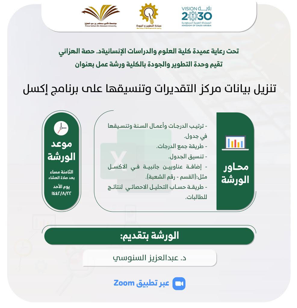 لقد أدت التطورات السريعة في مجال التقنية إلى ظهور أنماط جديدة للتعلم والتعليم ومنها التعلم الإلكتروني، حيث أقامت وحدة التطوير والجودة بكلية العلوم والدراسات الإنسانية بحوطة بني تميم ورشة عمل في مجال ( التعلم الإلكتروني) بعنوان (تنزيل بيانات مركز التقديرات وتنسيقها على برنامج اكسل) تحت رعاية عميدة الكلية الدكتورة/ حصة بنت سعود الهزاني، ومن تقديم الدكتور/ عبدالعزيز السنوسي، وذلك في يوم الأحد الموافق: 1442/8/22هـ، في تمام الساعة الثامنة مساءً، عبر برنامج الزووم.