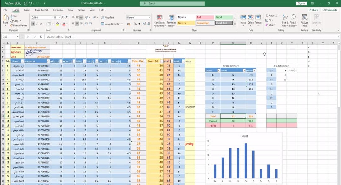 1- ترتيب الدرجات وأعمال السنة وتنسيقها في جدول.