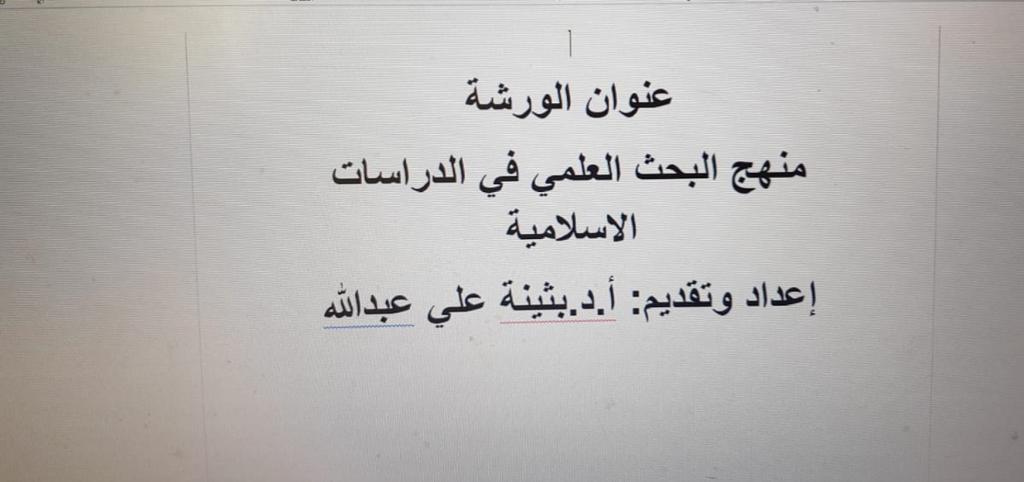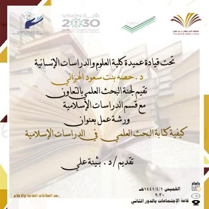 نظمت لجنة البحث العلمي بالتعاون مع قسم الدراسات الإسلامية بكلية العلوم والدراسات الإنسانية بحوطة بني تميم ، ورشة عمل بعنوان : منهج البحث العلمي في الدراسات الاسلامية ،تحت قيادة عميدة الكلية د/ حصه بنت سعود الهزاني، وذلك يوم الخميس الموافق ١/٤/١٤٤١ هـ بقاعة الاجتماعات بالدور الثاني، قدمتها أ.د. بثينة علي عبدالله ، الاستاذ المشارك بقسم الدراسات الاسلامية ورئيسة قسم الكيمياء . وقد استهدفت الورشة أعضاءهيئة التدريس والطالبات .وتهدف الورشة الي :