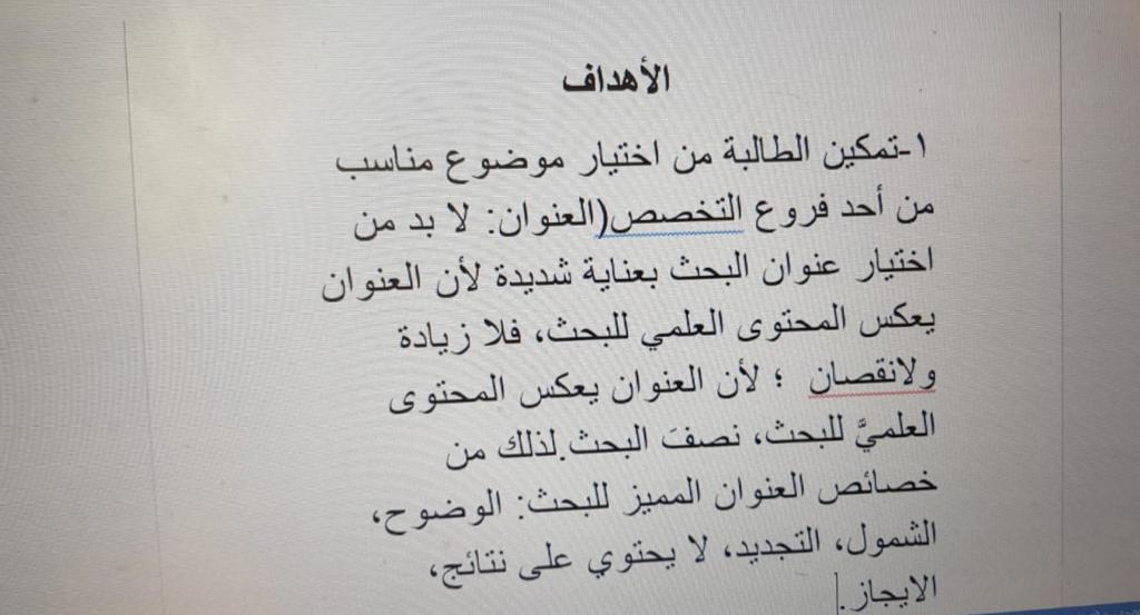 ١/ تمكين الطالبة من اختيار موضوع مناسب من احد فروع التخصص .