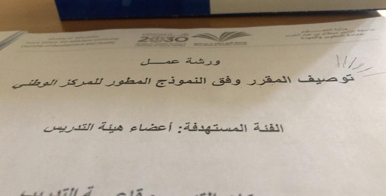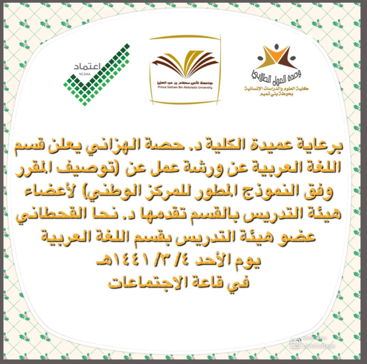تحت قيادة عميدة كلية العلوم والدراسات الإنسانية بحوطة بني تميم. د/ حصة بنت سعود الهزاني، قدم قسم اللغة العربية يوم الأحد الموافق: 1441/4/3هـ ورشة عمل بعنوان(توصيف المقرر وفق النموذج المطور للمركز الوطني) لأعضاء هيئة التدريس بالقسم من تقديم د. نحا القحطاني عضو هيئة التدريس بقسم اللغة العربية، تناولت عددًا من المحاور تلخصت في مقدمة تذكيرية بمعنى التوصيف للمقرر وعلاقته بالخطة، وتوضيح بعض المفاهيم الجديدة في النموذج المطور، وكيفية حساب الساعات الفعلية والفرق بينها وبين الساعات المعتمدة للمقرر، وانتهت إلى ضرورة التقيد بما جاء في خطة المقرر والبرنامج المقيدة في القسم، ولاقت الورشة استحسان الحاضرات من أعضاء الهيئة التدريسية، واختتمت بالإجابة على تساؤلاتهن.
