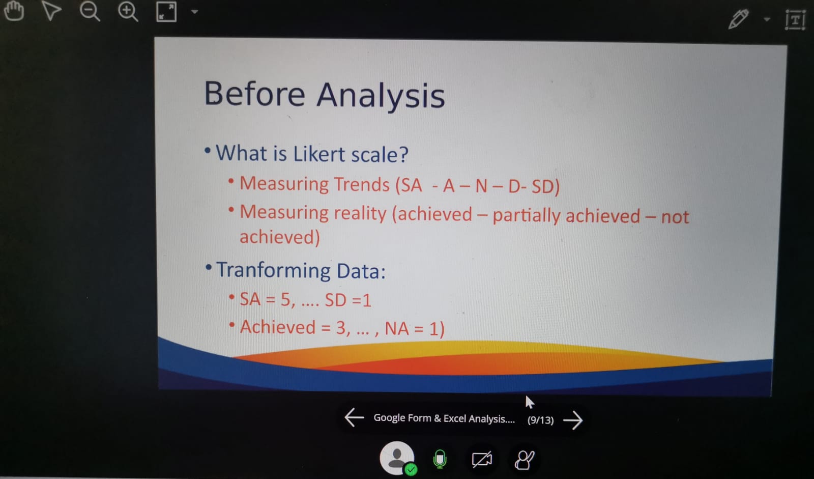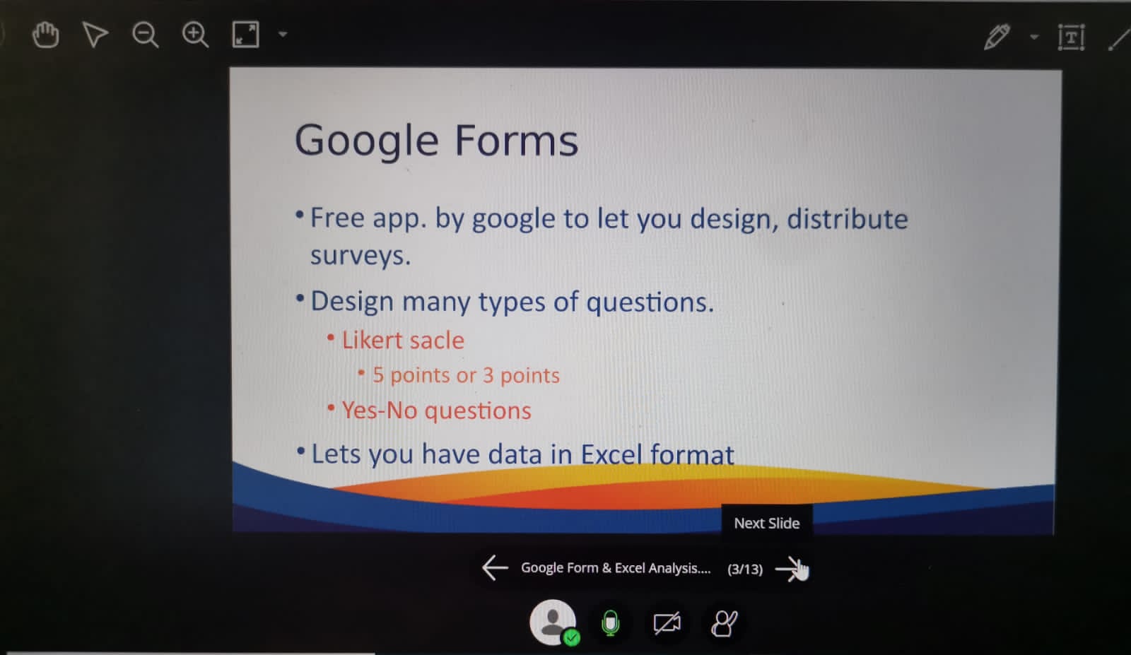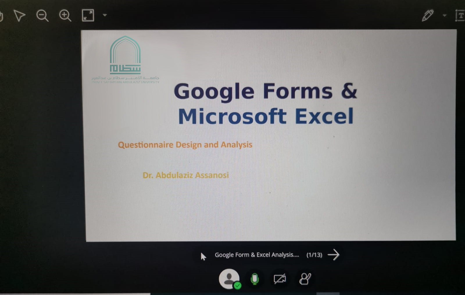 تناولت هذه الورشة طريقة تحليل بيانات الاستبانات باستخدام برنامج مايكروسوفت إكسل. حيث تم تقديم عرض توضيحي عن كيفية تصميم الاستبانات باستخدام نماذج جوجل وأنواع الاستبانات التي يمكن تصميمها من خلال نماذج جوجل، ومن ثم تم مشاركة الحضور بملف إكسل يحتوي على استبانة وتقديم مثال عملي عن طريقة تحليل الاستبانة باستخدام البرنامج حيث تسنى للحضور تطبيق المهارة في وقت الورشة، وفي نهاية الورشة تم فتح باب النقاش والاجابة على أسئلة واستفسارات الحضور.