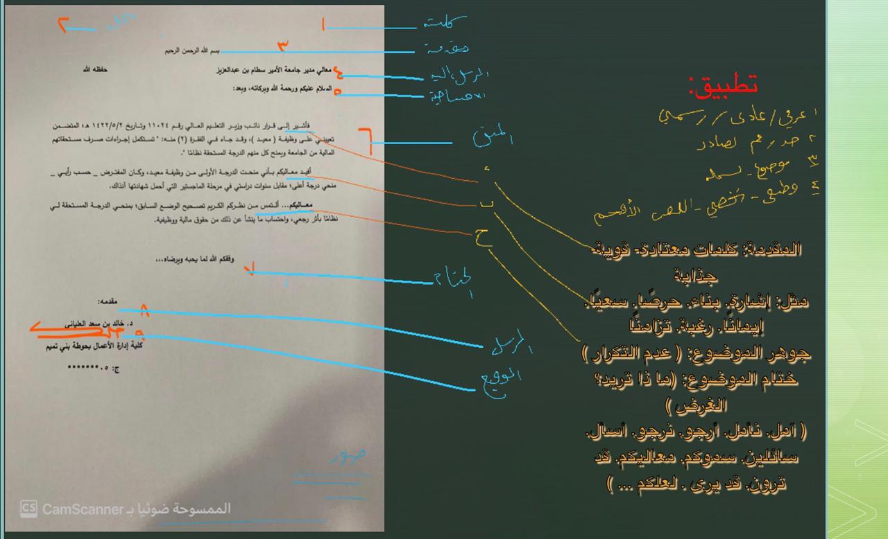أقام قسم الدراسات الإسلامية بكلية العلوم والدراسات الإنسانية بحوطة بني تميم بالتعاون مع وحدة التطوير والجودة ورشة تدريبية بعنوان: إعداد وصياغة الخطابات الإدارية تحت رعاية عميدة الكلية د. حصة بنت سعود الهزاني. وذلك في يوم الثلاثاء الموافق: 1442/2/12هـ. في تمام الساعة (9)ص عبر برنامج (ZOOM). وقد ألقاها الدكتور: خالد الذيابي، تناول فيها أهمية الخطابات الإدارية، ومستوياتها، وأغراضها، وعناصرها، وأساليب الصياغة. كما تطرق إلى أهداف الخطابات الإدارية وماله من أثر على شكل الخطاب وصياغته وحجم المسؤولية الناشئة عنه. واختتمت الورشة بتطبيق عملي على (خطاب) لتوضيح العناصر اللازمة في الخطابات.