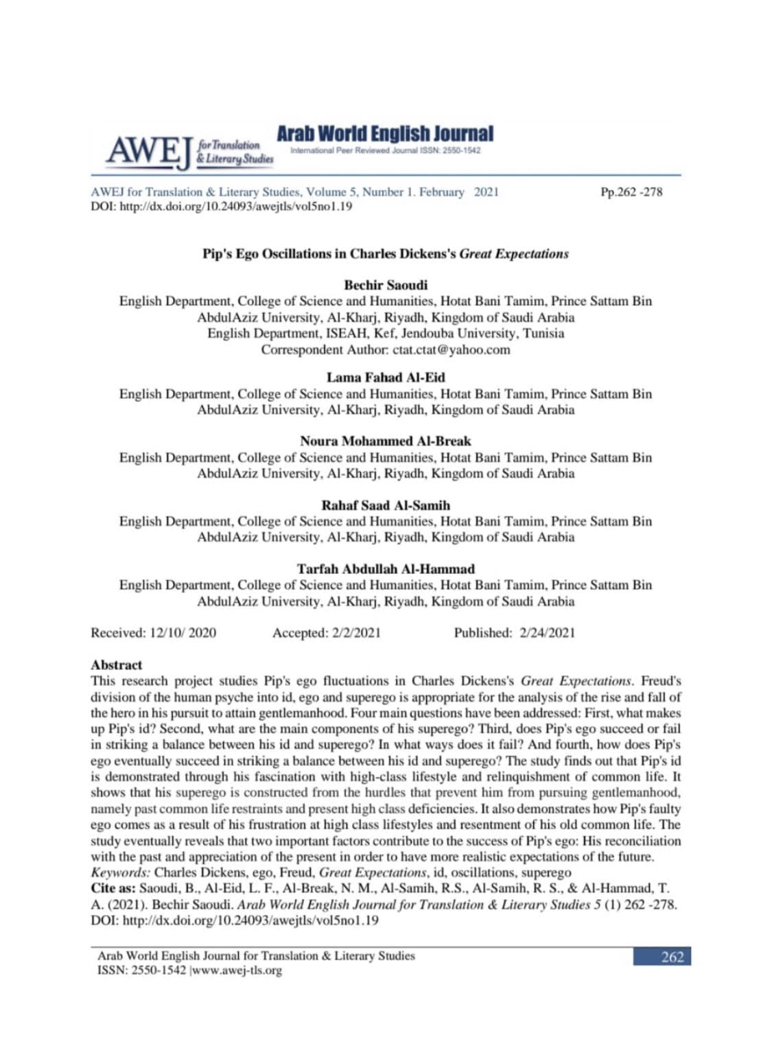 Pip's Ego Oscillations in Charles Dickens's Great Expectations (تأرجحات الأنا في رواية آمال عظيمة للكاتب الإنجليزي تشارلز ديكنز)، في المجلة الأمريكية العلمية المحكمة The Arab World English Journal for Literature and Translation في المجلد الخامس، رقم ١ من المجلة بتاريخ ٢٤ فبراير ٢٠٢١.