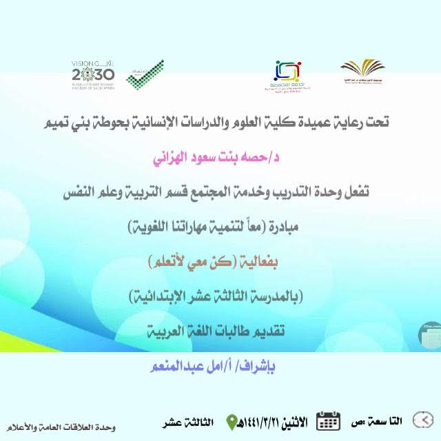 تسعى كلية العلوم والدراسات الإنسانية بحوطة بني تميم الى تعليم الطرق والاستراتيجيات التي يمكن من خلالها تنمية المهارات اللغوية لدى الطالبات تحت قيادة عميدة الكلية د/ حصة بنت سعود الهزاني. حيث أقامت وحدة الخدمة المجتمعية بقسم التربية وعلم النفس فعاليتها بعنوان (كن معي لأتعلم ) استكمالاً لمبادرة ( معاً لتنمية مهاراتنا اللغوية)، وذلك يوم الأثنين الموافق: ١٤٤١/٣/٢١هـ بالمدرسة الثالثة عشر الابتدائية في تمام الساعة التاسعة صباحاً، قامَ على تنفيذها طالبات اللغة العربية المستوى السادس تحت إشراف ا/أمل عبد المنعم . اشتملت الفعالية على عرض بور بوينت عن القراءة، ومسابقات، وقراءة قصة قصيرة وجمل يتم تداولها بين الطالبات لإتقان قراءتها وكتابتها، كما استهدفت الفعالية طالبات المدرسة الابتدائية ممن لا يمتلكن مهارات القراءة والكتابة بصورة جيدة. اختتمت الفعالية بترحيب من طالبات ومعلمات المدرسة وشكر القائمات عليها.