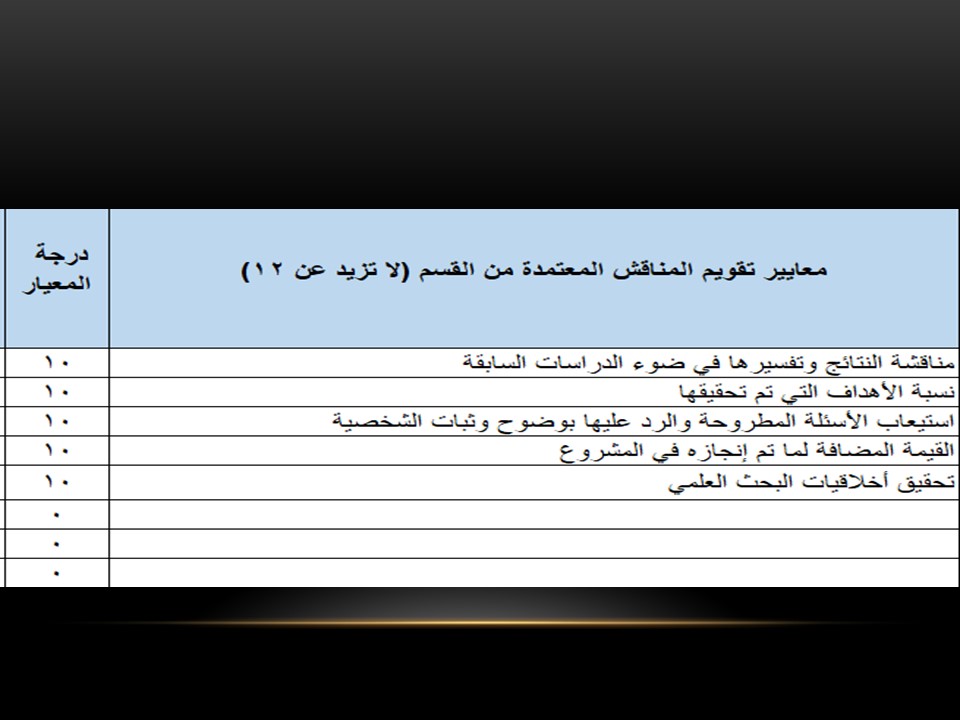 دارت محاور اللقاء حول معايير التقويم الأساسية للإشراف والمناقشة ، متضمنةً أخلاقيات البحث العلمي ، انتقلت بعدها إلى خطوات إعداد بحث مشروع التخرج ، وخطة تقسيم البحث ، وكذلك طريقة تناول الدراسات السابقة ، وآلية التوثيق العلمي ، وكيفية استيفاء اهداف البحث ، واختتمته بضرورة إثبات المراجع ، وترتيب أجزاء البحث .