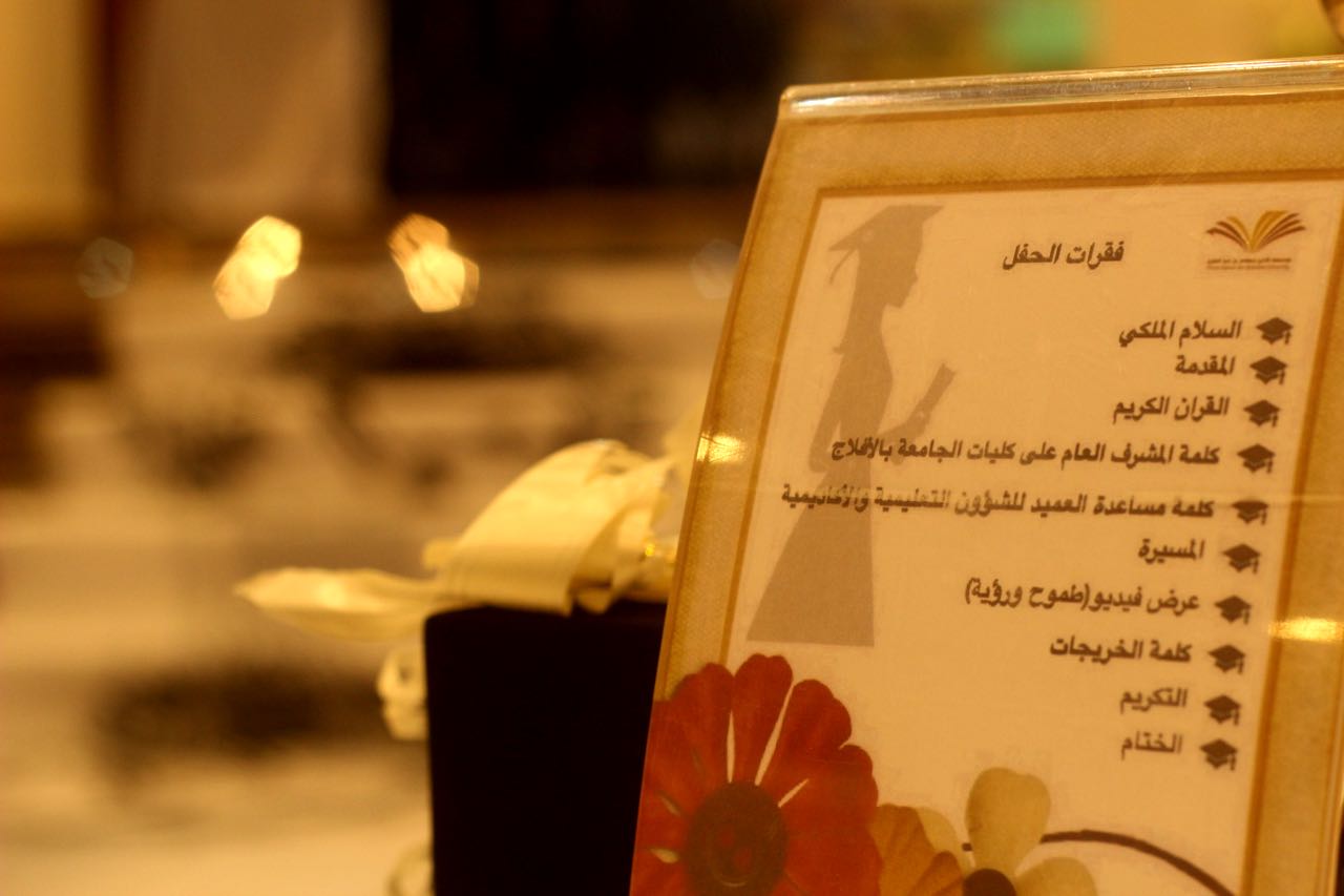 ابتدأ البرنامج بمقدمة قدمتها الطالبة منيره ال زعير ثم تلت الطالبة نوره الشكره آيات من القرآن الكريم ، بعد ذلك ألقيت كلمة المشرف على كليات الجامعة بالأفلاج الدكتور مسفر الكبيري، التي أوضح فيها أن التخرج هو بداية العمل الجاد، وبداية التعليم الموجة وليس نهاية المطاف .