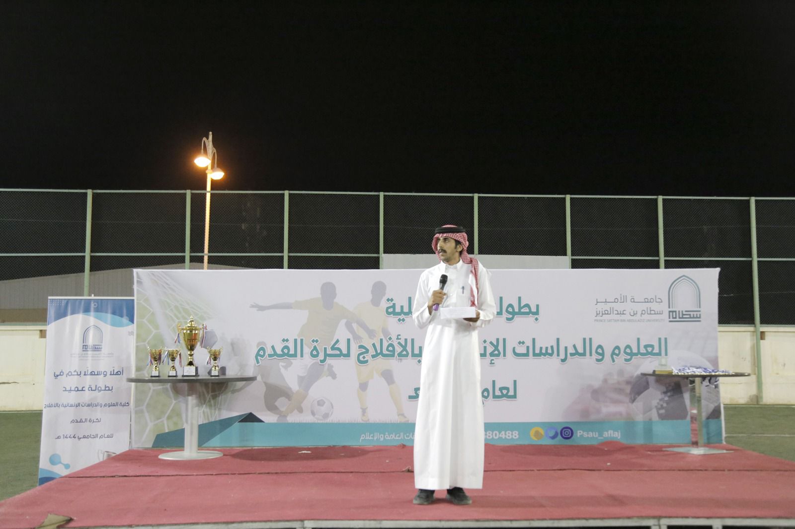 في ليلة سادتها الروح الرياضية والحماسية أقيمت يوم الأثنين 1444/11/2 هـ المباراة النهائية لبطولة سعادة عميد كلية العلوم والدراسات الإنسانية بالأفلاج بين الأقسام الأكاديمية؛ وقد شرف اللقاء بحضور سعادة عميد الكلية المكلف الدكتور محمد بن هذال الدوسري ورؤساء الأقسام الأكاديمية والإدارية وعدد من منسوبي الكلية.