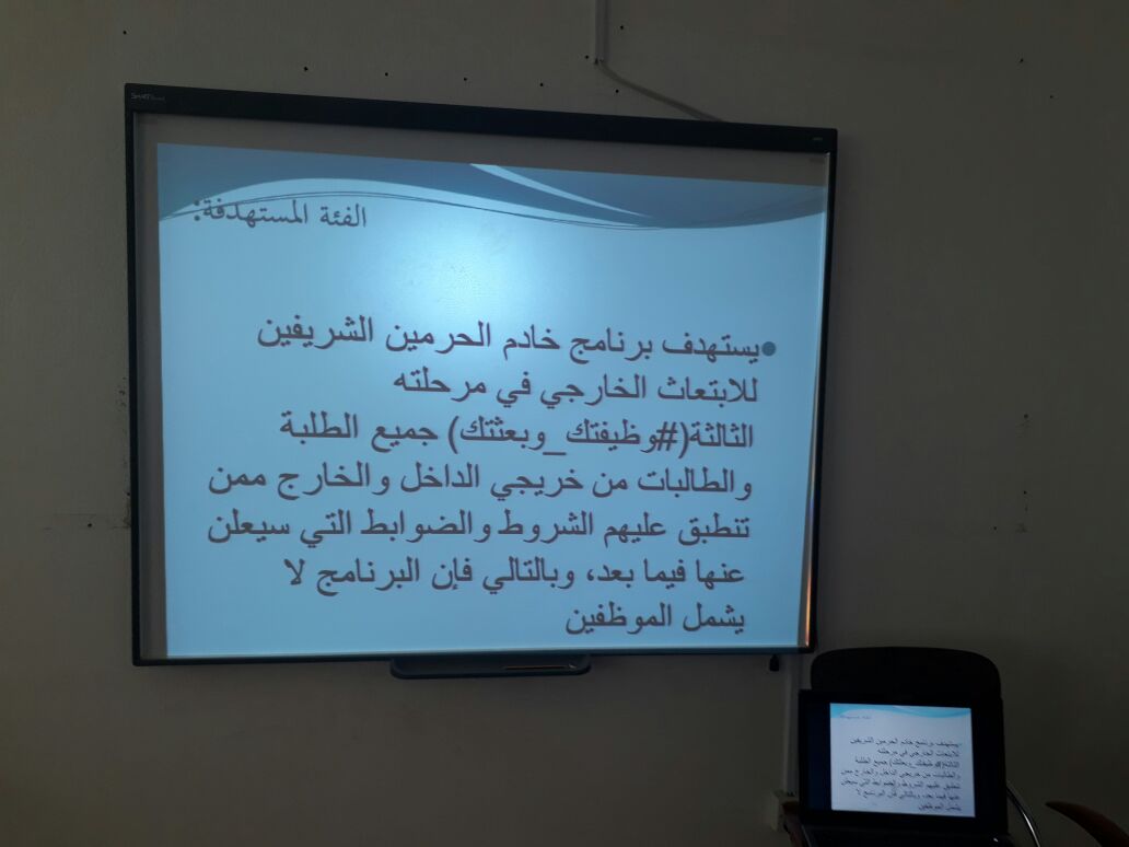 ثم بينت الدكتورة أننا الآن بصدد المرحلة الثالثة والتي يبدأ التقديم لها في شهر شوال 1439هـ، وذكرت الدكتورة فاطمة شرح مفصل لشروط الإبتعاث على البرنامج. "الشروط العامةً للإبتعاث، والشروط الخاصة بكل مرحلة" ، والتي يجب توافرها في الخريجات ليلتحقن بالبرنامج.