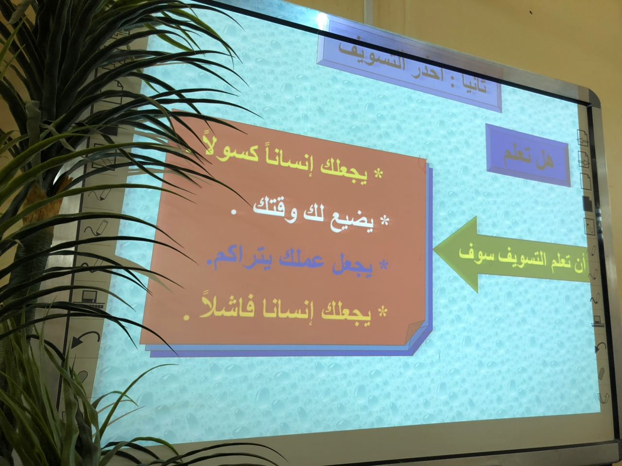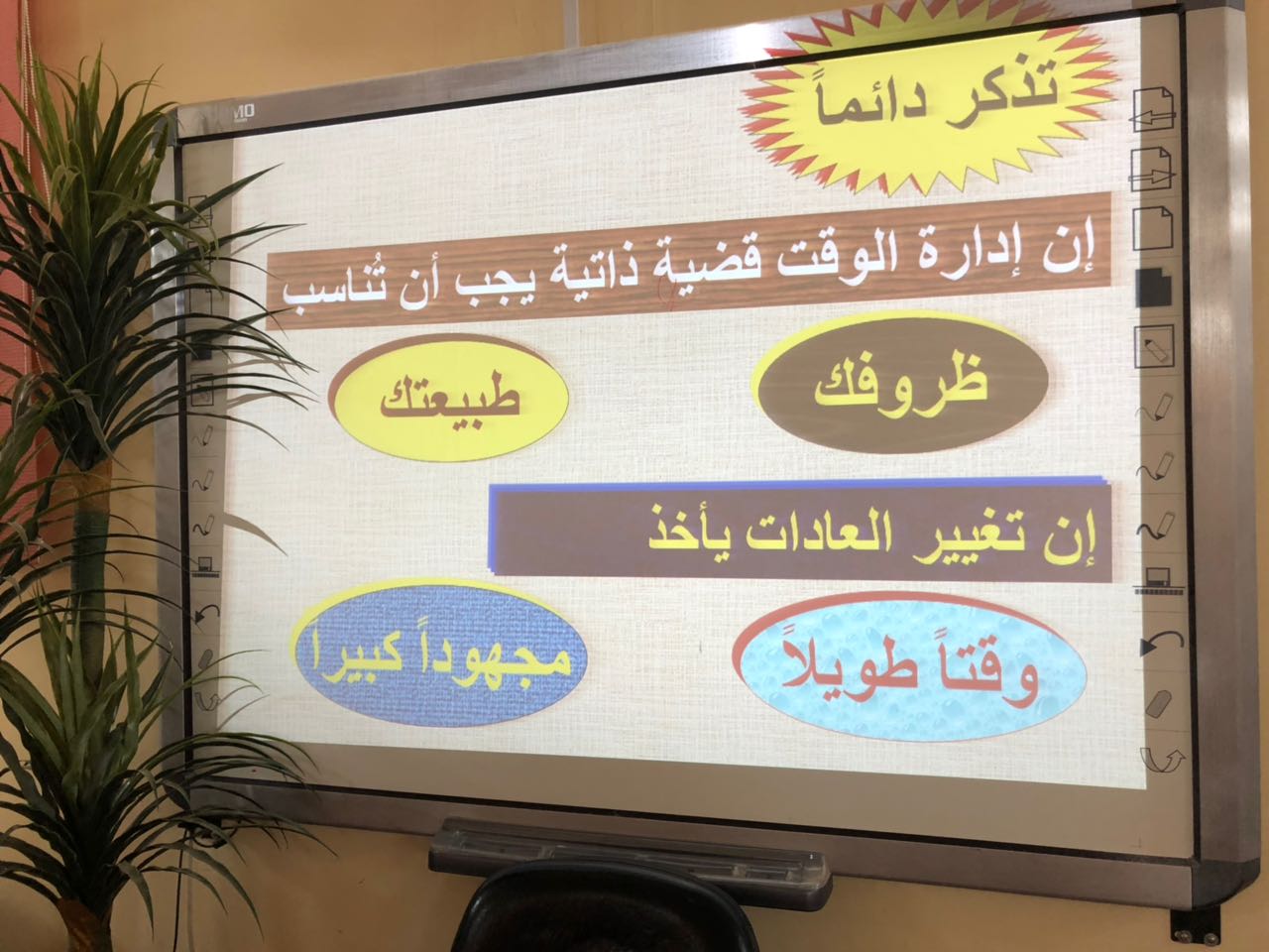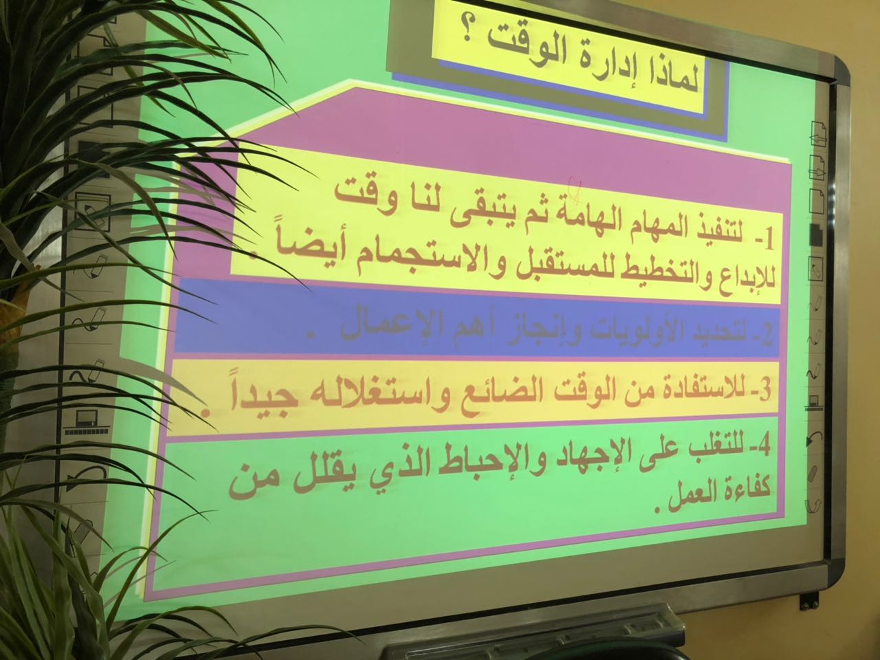 كما تطرقت إلى مسببات ضياع الوقت وكيف يمكننا الإبتعاد عن هذه المسببات ,ووضحت بعض الأمور التي من خلالها يمكننا استثمار أوقاتنا وكيف يمكننا التخطيط من خلال صياغة الأهداف