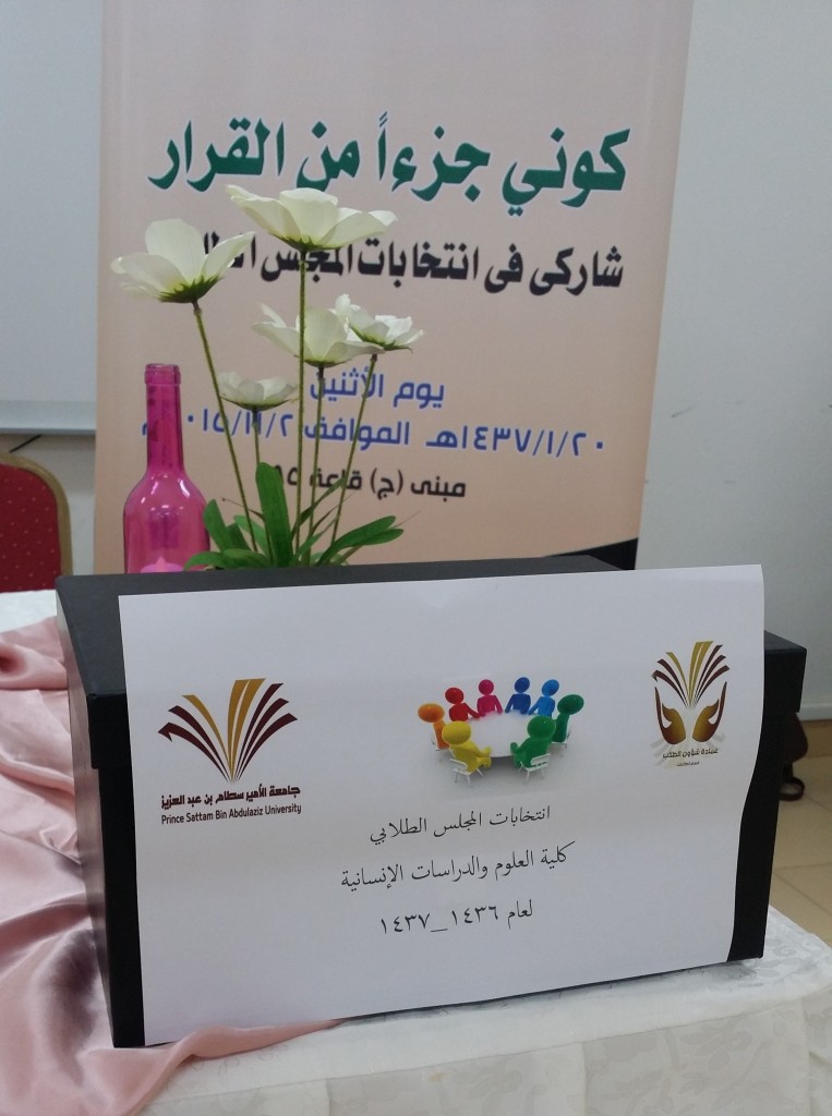 انتهت كلية العلوم والدراسات الإنسانية (شطر الطالبات) من إجراءات هيكلة المجلس الطلابي للكلية، تحت إشراف اللجنة العليا للانتخابات التي تترأسها الدكتورة بشرى بنت أحمد الحماد، وذلك في قاعة (85) بمبنى (ج).