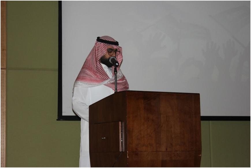 بداء الحفل عند الساعة العاشرة صباحاً حيث استهلت برامجه بآيات عطره من القرآن الكريم جودها الطالب فيصل السهلي وبعدها ألقى عميد كلية العلوم والدراسات الإنسانية كلمة أستعرض فيها جهود المؤسس الملك عبدالعزيز -طيب الله ثراه- وأبناءه البرره من بعده في توحيد وإزدهار ونمو هذه البلاد التي أصبحت بفضل من الله ثم قادتها في مصاف الدول المتقدمة.