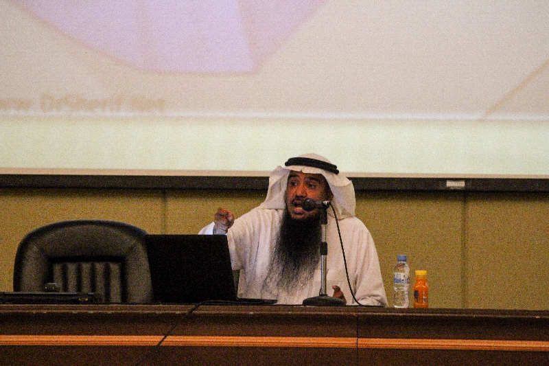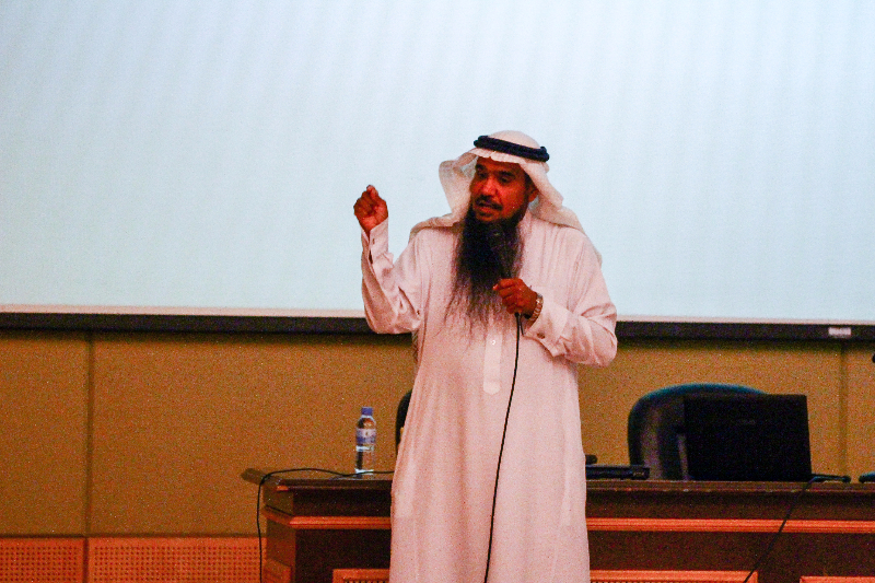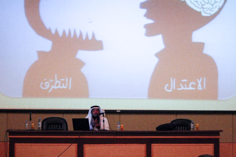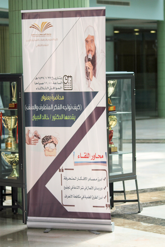 حرصا من كلية العلوم والدراسات الإنسانية بالخرج وتماشياً مع سياسة الجامعة المنبثقة من رؤية 2030 ، وبرعاية سعادة الدكتور عبدالرحمن الحارثي – عميد الكلية – عُقدت يوم الثلاثاء الموافق 27 / 1 / 149هـ هـ ذلك بمسرح الكلية محاضرة بعنوان " كيف نواجه الفكر المتطرف والعنف " والتي ألقاها سعادة الدكتور خالد الدبيان أستاذ العقيدة والمذاهب الفكرية المعاصرة بجامعة الأمير سطام بن عبدالعزيز. حيث اتسمت المحاضرة بقوة الحجة والبيان لما جاء بها من إحصائيات هامة ، حيث ذكر سعادته أن معظم الإشاعات تُنقل من خلال وسائل التواصل الاجتماعي - علي رأسها تويتر وفيس بوك والواتس آب – وأن هناك ما يزيد عن 36% -والعدد في زيادة – من السعوديين يقعون في خطأ نقل الإشاعات دون التأكد من صحة ما ينقلونه من معلومات ، كما قدم سعادته مقارنة بين الإسلام المعتدل والتطرف وأكد على أهمية بناء الشخصية من خلال القراءة والفهم والتحليل والتثبت، كما طوف بالحضور في جوانب مشرقة من سيرة الرسول محمد صلى الله عليه وسلم في موضوع المحاضرة.