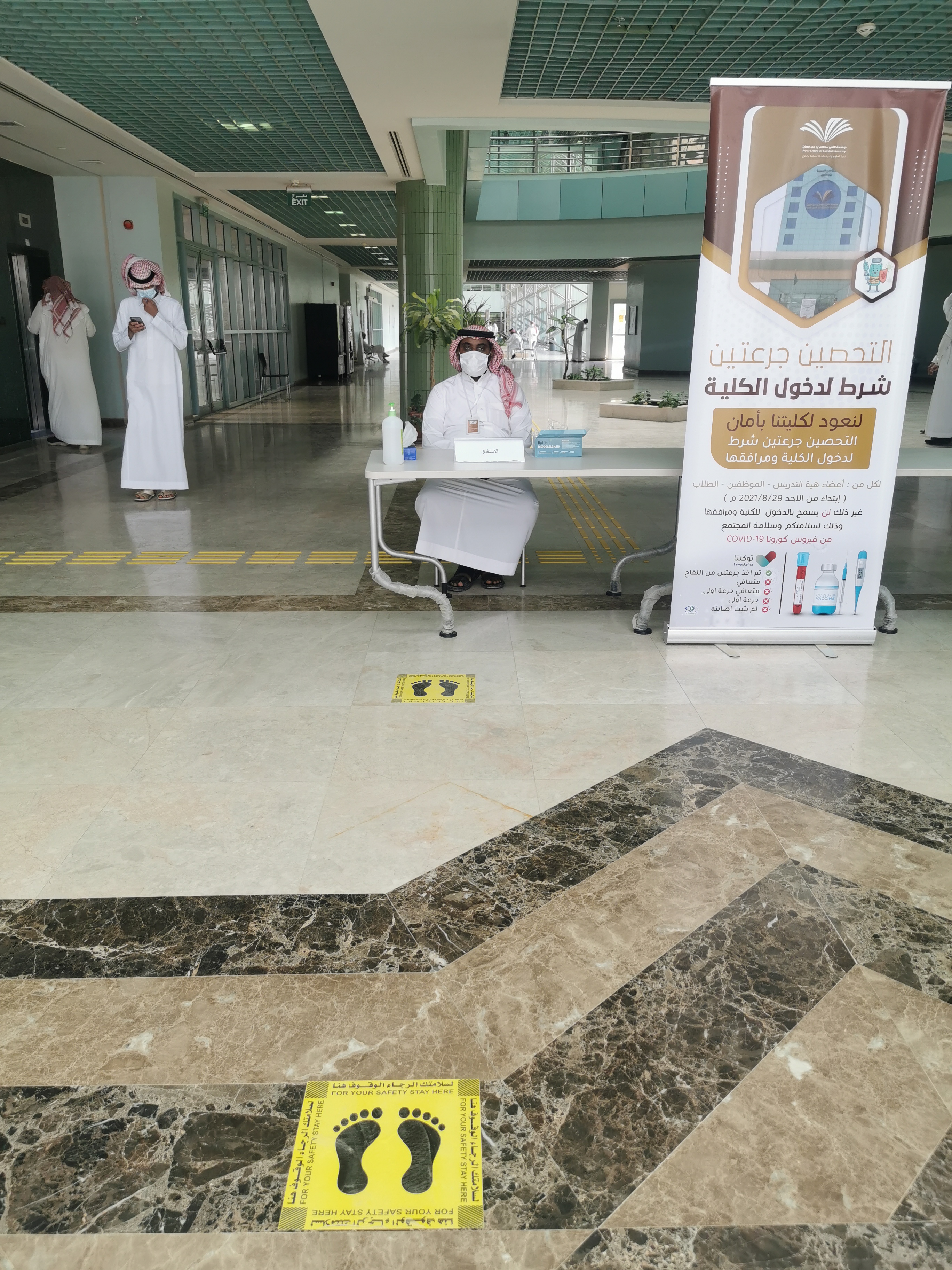 بمتابعة من سعادة عميد كلية العلوم والدراسات الإنسانية بالخرج الدكتورعبدالرحمن الحارثي استقبلت الكلية أبنائها الطلاب، وذلك بتطبيق الإجراءات الاحترازية حرصا على سلامة الطلاب وأعضاء هيئة التدريس والموظفين والمراجعين، وذلك بالتأكد من أخذ اللقاح (جرعتين) للسماح بدخول مقر الكلية، وكذلك تم تهيئة القاعات والمعامل بجميع الإجراءات الاحترازية.
