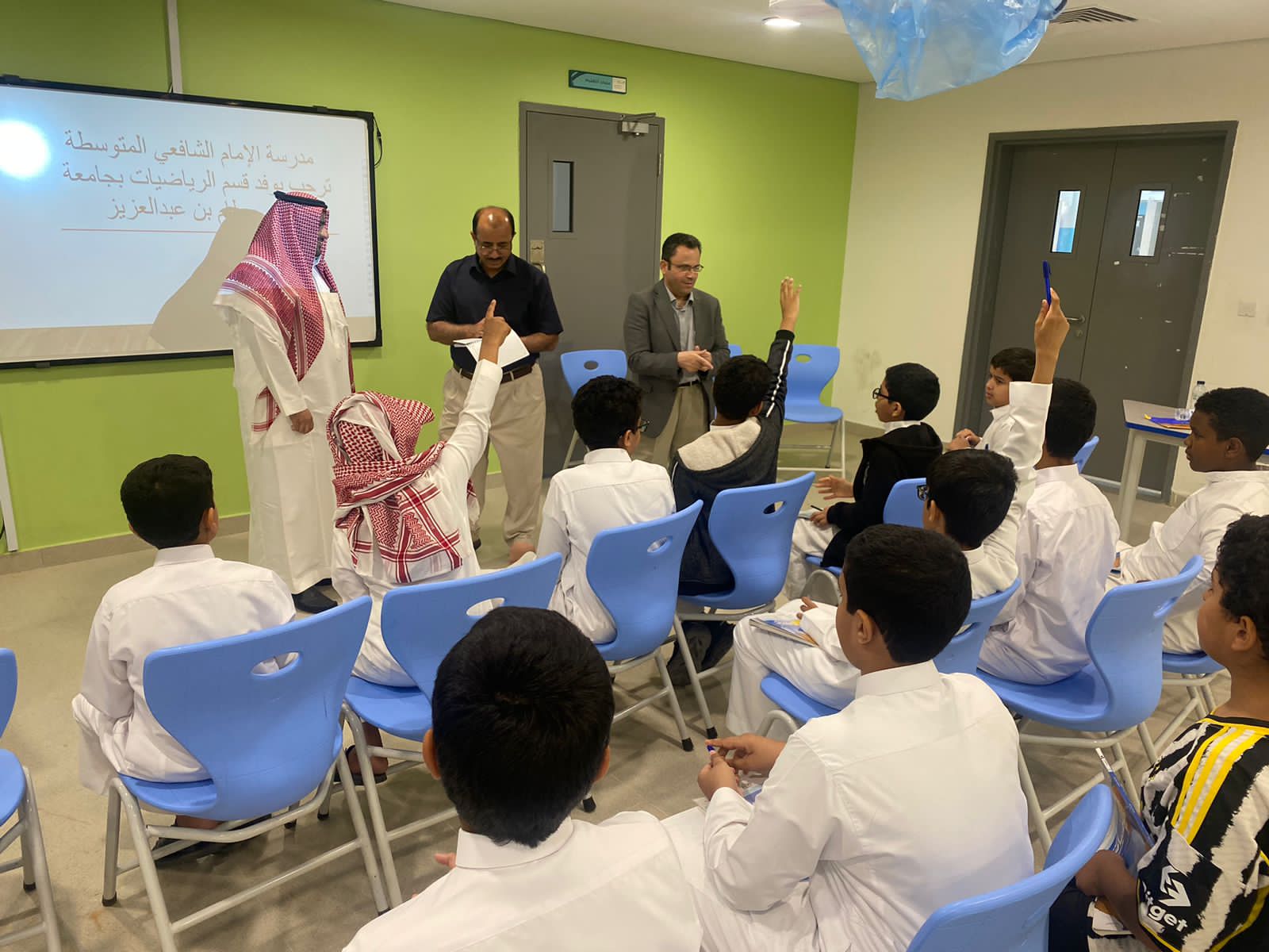 حيث التقى الوفد متمثلًا بكل من د. عبد الكريم حمارشة منسق لجنة خدمة المجتمع بالقسم و د. خضر خان و د. فهد الجعيدي بعدد من طلاب المدرسة.