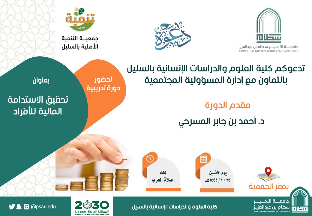 تحقيقًا لمبدأ الشراكة المجتمعية، نفذت كلية العلوم والدراسات الإنسانية بالسليل، يوم الإثنين 9/10/2023م، الموافق 24/3/1445هـ، برنامجا تدريبيا بعنوان " تحقيق الاستدامة المالية للأفراد " والذي استهدف جمعية التنمية الأهلية بالسليل.