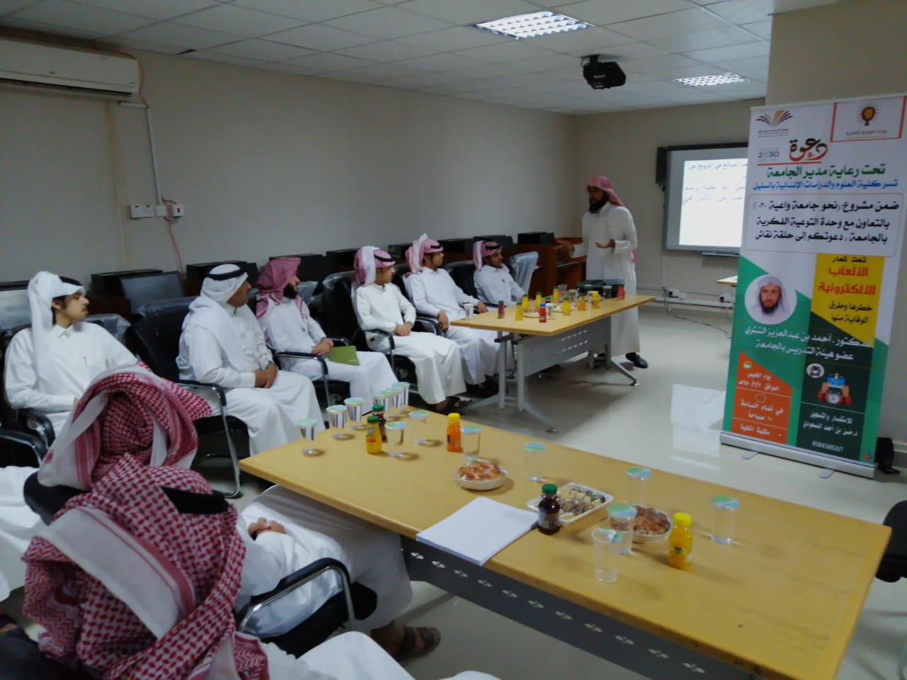 تحت رعاية معالي مدير الجامعة نظمت وحدة الأنشطة الطلابية في كلية العلوم والدراسات الإنسانية بالسليل ضمن مشروع (نحو جامعة واعية-٣-) وبالتعاون مع وحدة التوعية الفكرية بالجامعة، يوم الخميس الموافق 15/11/2018 م حلقة نقاش بعنوان ” الألعاب الإلكترونية خطرها وطرق الوقاية منها ” في مكتبة الكلية قدمها الدكتور أحمد بن عبدالعزيز الشثري أستاذ الفقه المساعد بجامعة الأمير سطام بن عبدالعزيز.