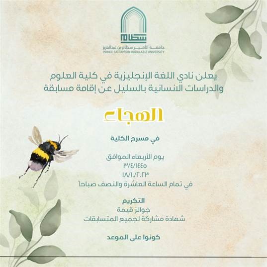 نظمت وحدة العمل الطلابي متمثلة في نادى اللغة الانجليزية بكلية العلوم والدراسات الإنسانية بالسليل مسابقة بعنوان (مسابقة الهجاء) في مسرح كلية العلوم والدراسات الإنسانية بالسليل (شطر الطالبات) يوم الأربعاء الموافق ٣\٤\١٤٤٥ هـ.