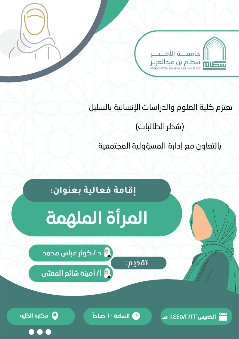 نظمت كلية العلوم والدراسات الإنسانية بالسليل (شطر الطالبات) بالتعاون مع إدارة المسؤولية المجتمعية، فعالية للطالبات بعنوان( المرأة الملهمة ) في يوم الخميس 22/2/1445هـ في تمام الساعة 10 صباحاً. وقد حضر الفعالية عدد من أعضاء الهيئة التدريسية والطالبات، كما وتشرفنا بحضور الدكتورة / كوثر عباس محمد، والاستاذة / أمينة شائع المغثى، لتقديم الفعالية.