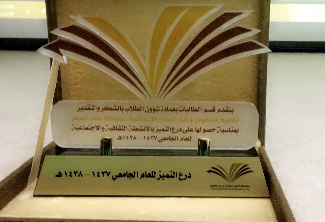 في صباح مشرق بالنشاط و مفعم بالمسرات، حصلت كلية العلوم والدراسات الإنسانية بحوطة بني تميم على درع التميز في الأنشطة الثقافية والاجتماعية للعام الجامعي 1437 / 1438 هـ ، تسلمت الدرع عميدة الكلية الدكتورة حصة بنت سعود الهزاني حيث أقامت عمادة شؤون الطالبات يوم الأحد 11 محرم حفل اليوم الوطني السابع والثمانون وإعلان درع التميز بالأنشطة الطلابية تحت رعاية وكيلة عمادة شؤون الطلاب الدكتورة دلال المطرفي. إذ نبارك لعمادتنا هذا الفوز والإنجاز الذي نفخر به جميعاً، نتقدم بالتهاني لمنسوبات وحدة العمل الطلابي الأستاذة إسلام العُمري والأستاذة منال الدحيم ونتمنى لهم دوام التميز والنجاح.