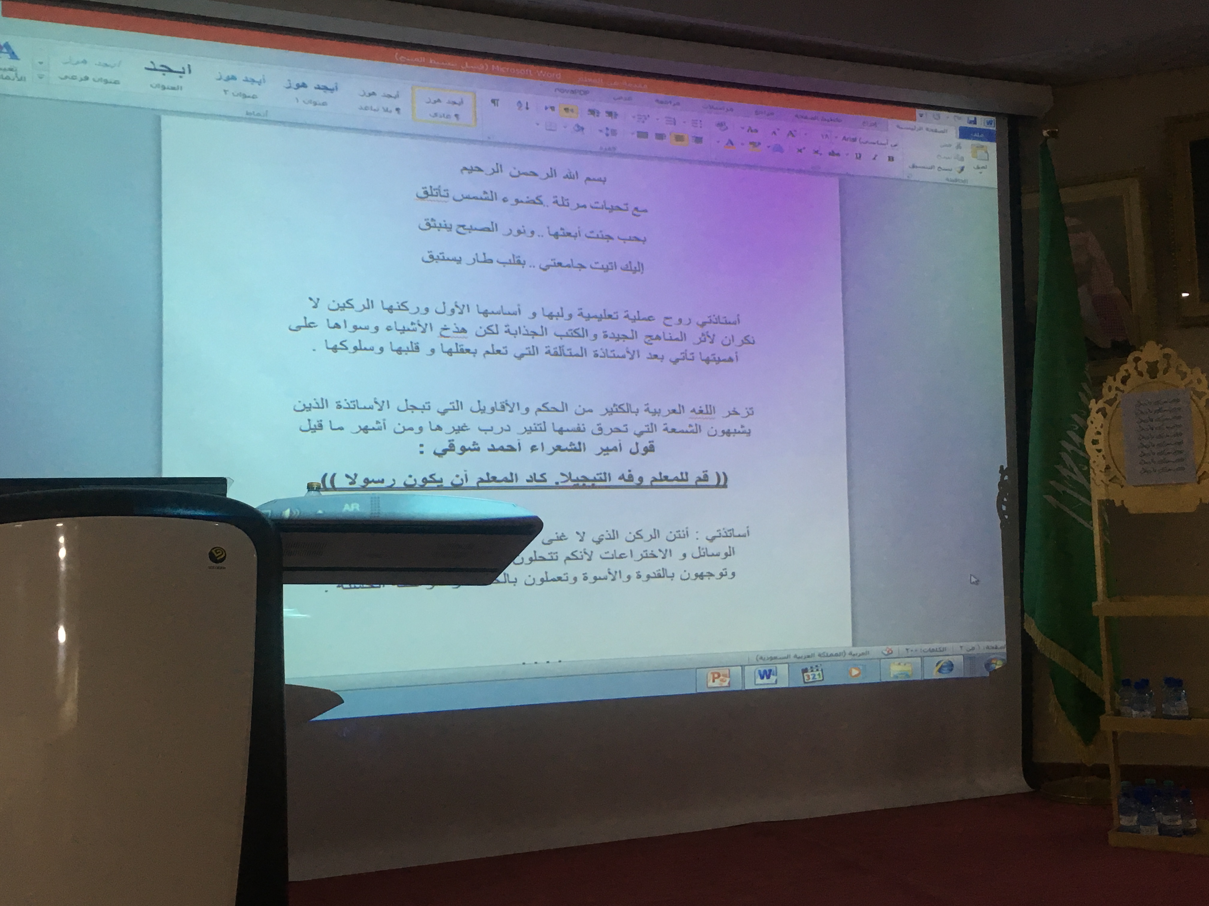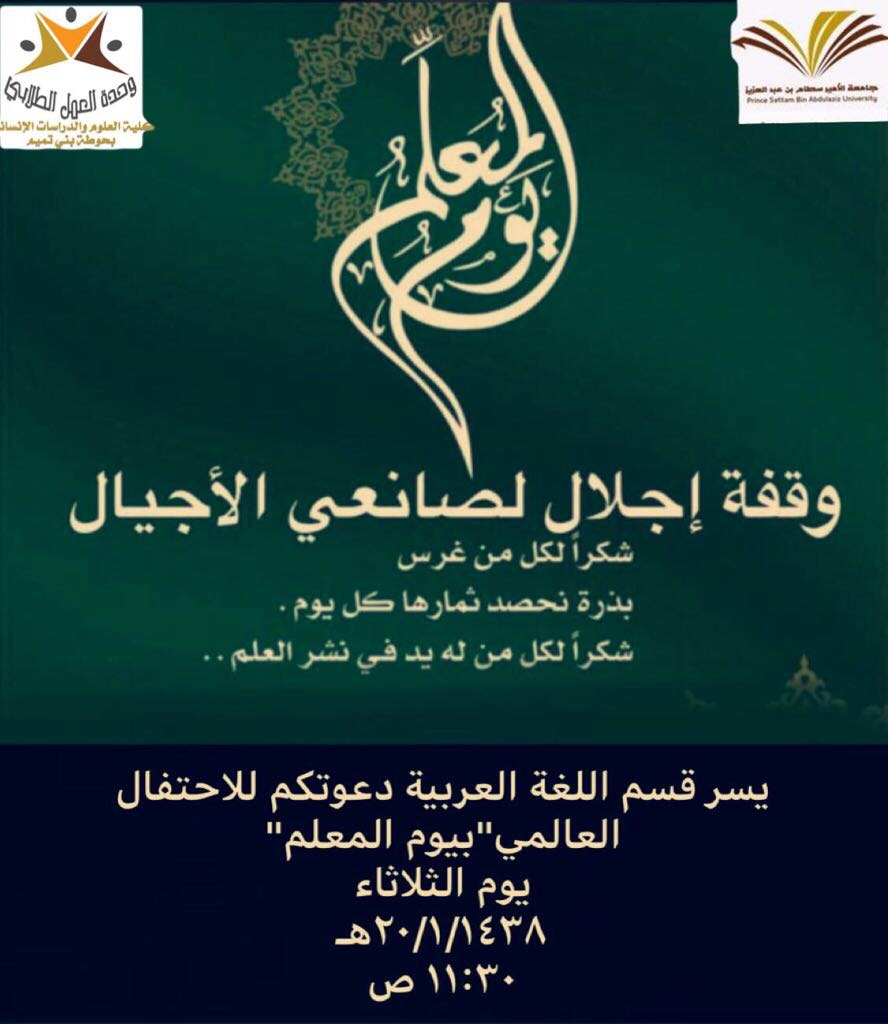 نظم قسم اللغة العربية في كلية العلوم والدراسات الإنسانية بحوطة بني تميم بالتعاون مع وحدة العمل الطلابي برنامج بعنوان (الاحتفال العالمي بيوم المعلم) يوم الثلاثاء الموافق 20/1/1439 في تمام الساعة 11:30صباحا بمسرح الكلية ، حضر الإحتفال عميدة الكلية الدكتورة حصة بنت سعود الهزاني حيث بدأ بكلمة شكر وعرفان لكل معلمة ساهمت في رفع مستوى الطالبة علمياً أو تربوياً أو ثقافياً، وشارك فيه الطالبات بذكر مواقف أثرت بهن وساهمت في رسم مستقبلهن التعليمي، كما شاركت الأستاذات برسائل وتوجيهات تبين أثر المعلم وأهميته ونبل الرسالة التي يحملها.