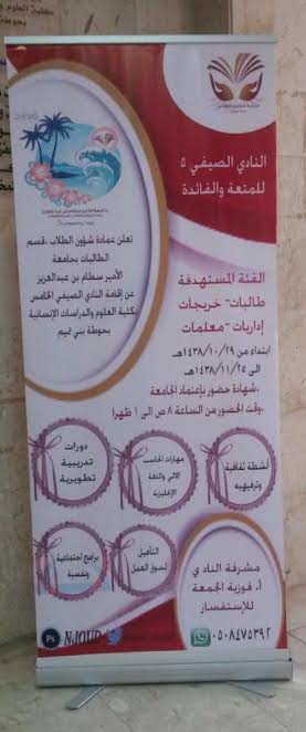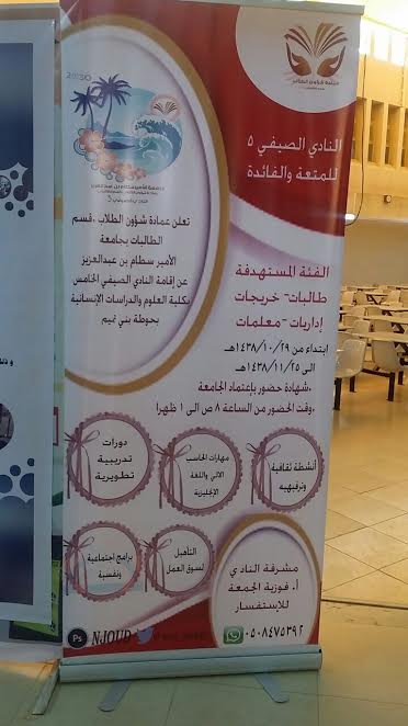 تعلن كلية العلوم والدراسات الإنسانية بحوطة بني تميم عن إقامة النادي الصيفي الخامس التابع لعمادة شؤون الطلاب قسم الطالبات بالجامعة والممتد من 29/ 10/ 1438هـ حتى 1438/11/25هـ لمدة أربعة أسابيع، حيث يستهدف جميع المهتمات بتطوير الذات من طالبات المرحلة الثانوية والجامعية والخريجات والمعلمات والموظفات والإداريات. تهدف برامج النادي الصيفي إلى تقديم البرامج المتنوعة والمفيدة من أنشطة ثقافية وترفيهية وبرامج لتطوير مهارات الحاسب الآلي واللغة الإنجليزية ودورات تدريبية تطويرية والتأهيل لسوق العمل بالإضافة إلى برامج اجتماعية ونفسية والتي سوف تساهم في رفع كفاءات المشاركات وتثقيفهن. يمنح النادي شهادات حضور باعتماد الجامعة ووقت الحضور سيكون من الساعة الثامنة صباحا إلى الساعة الواحدة ظهرا، حيث سيفتتح النادي فعالياته بمشيئة الله يوم الأحد الموافق 1438/10/29هـ فعلى الراغبات في الانضمام للنادي المبادرة بالتسجيل مع العلم بأن كل مشتركة ستمنح بطاقة خاصة لدخول النادي وسوف يتم عرض كافة البرامج وآلية العمل به من خلال اللقاء التعريفي الذي ستنظمه مشرفة النادي أ. فوزية الجمعة.
