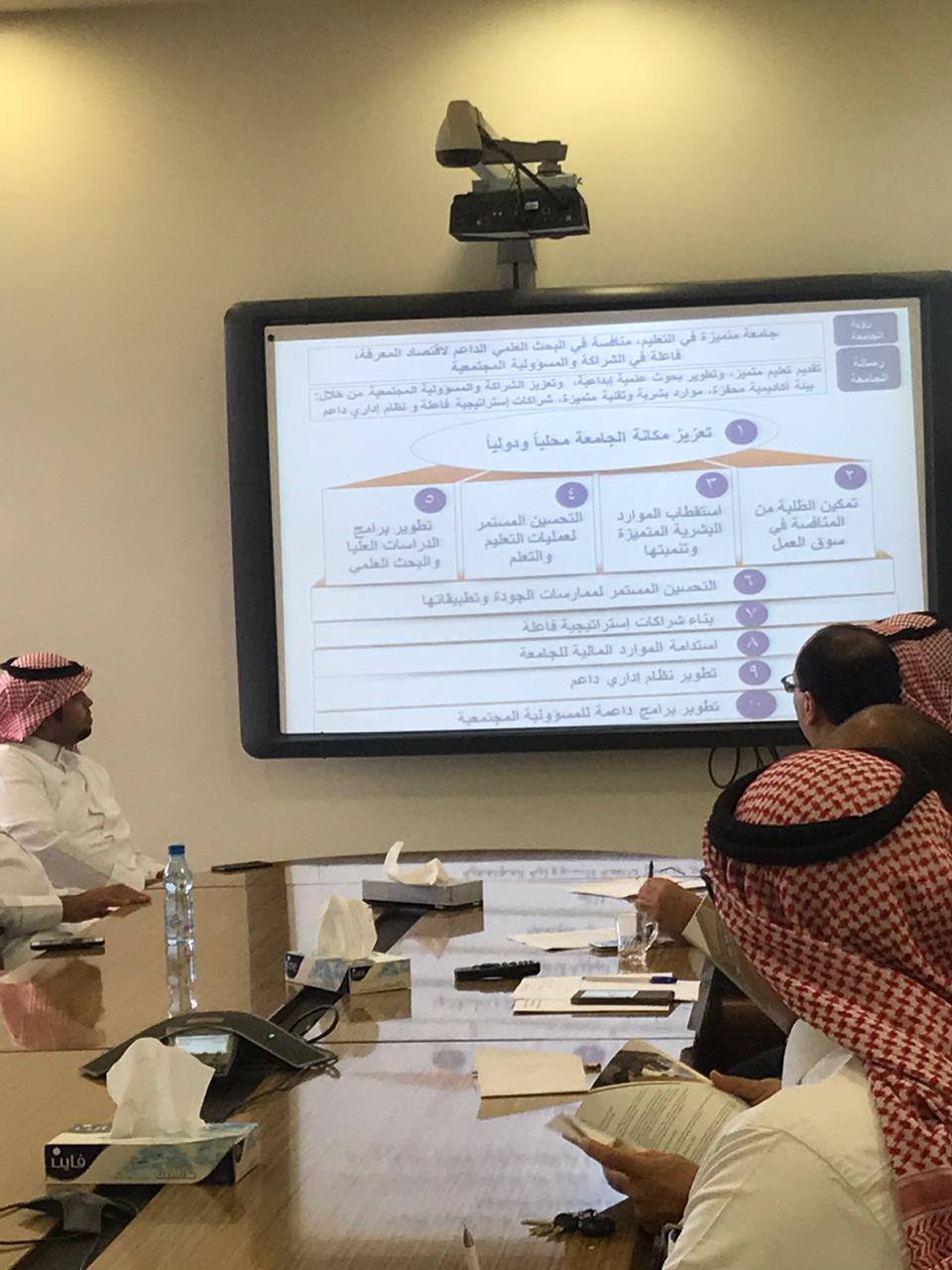 في اطار توجيهات معالي مدير الجامعة ومتابعة سعادة وكيل الجامعة للتطوير والجودة نظمت كلية العلوم والدراسات الانسانية اليوم الاثنين 18/03/1440 هـ وبرعاية من سعادة عميد الكلية ورشة عمل لتحديث خطتها الاستراتيجية للتواكب مع الخطة الاستراتيجية للجامعة في إصدارها الثاني. حيث قدم الورشة سعادة الاستاذ الدكتور/ جمال كمال الدين المستشار بوكالة الجامعة للتطوير والجودة وفي حضور وكلاء ورؤساء الأقسام وعدد من أعضاء هيئة التدريس والموظفين والطلاب بالكلية وتم التواصل مع شطر الطالبات عن طريق النظام الصوتي. وقد تناولت الورشة مناقشة جوانب الخطة الاستراتيجية للكلية وآليات تحديثها وكيفية ربطها بالخطة الاستراتيجية لجامعة الامير سطام بن عبدالعزيز الاصدار الثاني 2030.