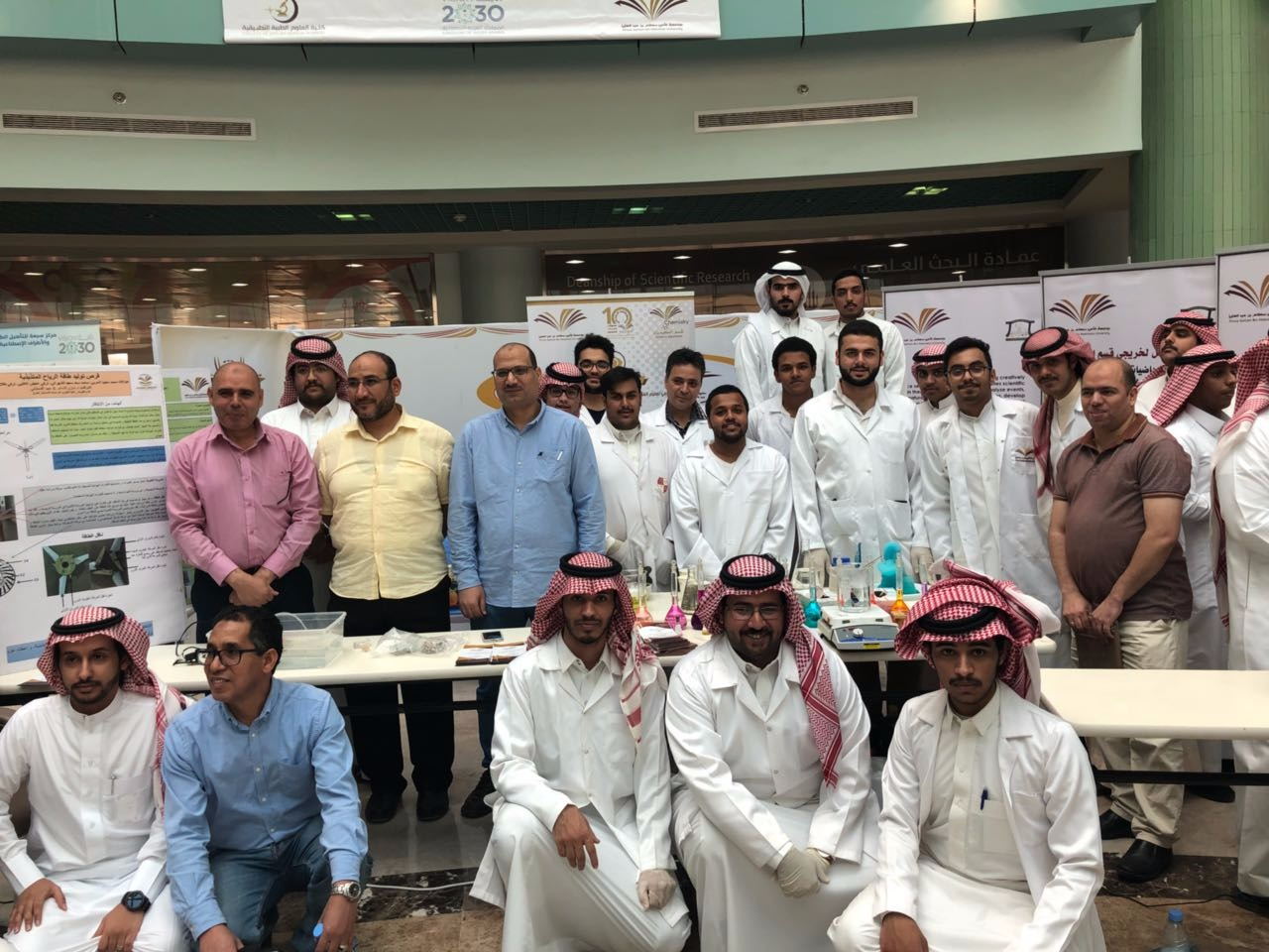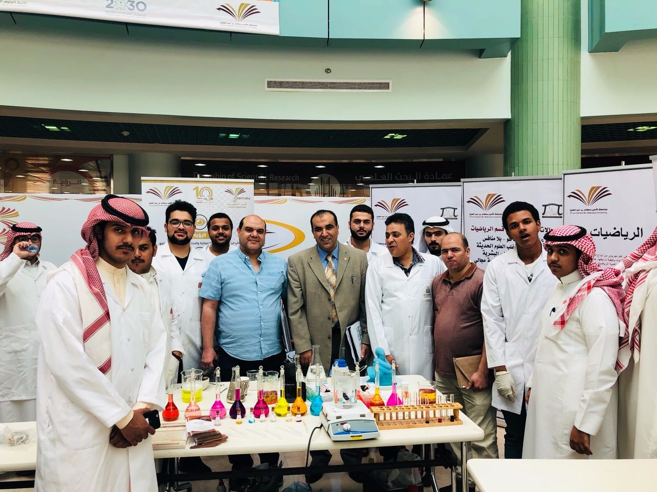 وقدم طلاب قسم الكيمياء أيضا مجموعة من التجارب الكيميائية التي توضح أن لعلم الكمياء أدوار متنوعة في حياة الإنسان من ضمنها التطبيقات الصناعية والدوائية العديدة. وقد نالت تلك العروض إعجاب الطلاب وكافة الحضور.