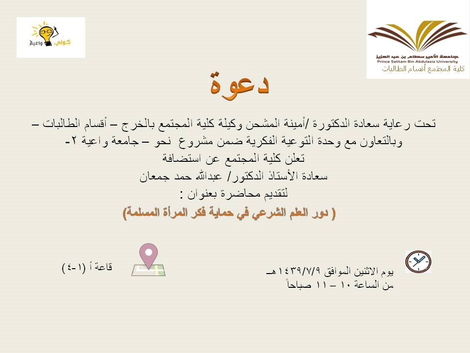 "دور العلم الشرعي في حماية فكر المرأة المسلمة "والتي سيلقيها سعادة الأستاذ الدكتور /عبدالله حمد جمعان ،وذلك يوم الأثنين الموافق9/7/1439هـ في تمام الساعة العاشرة صباحاً في مبنى الكلية