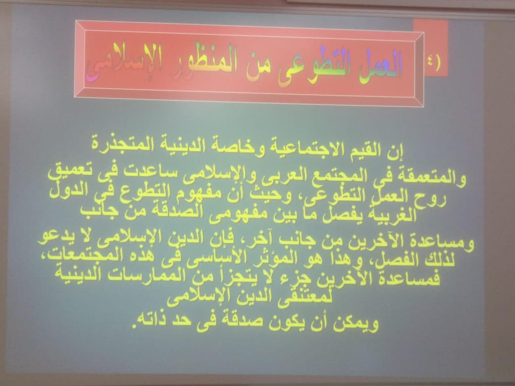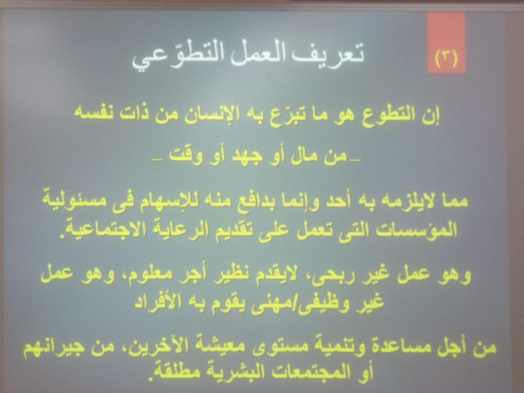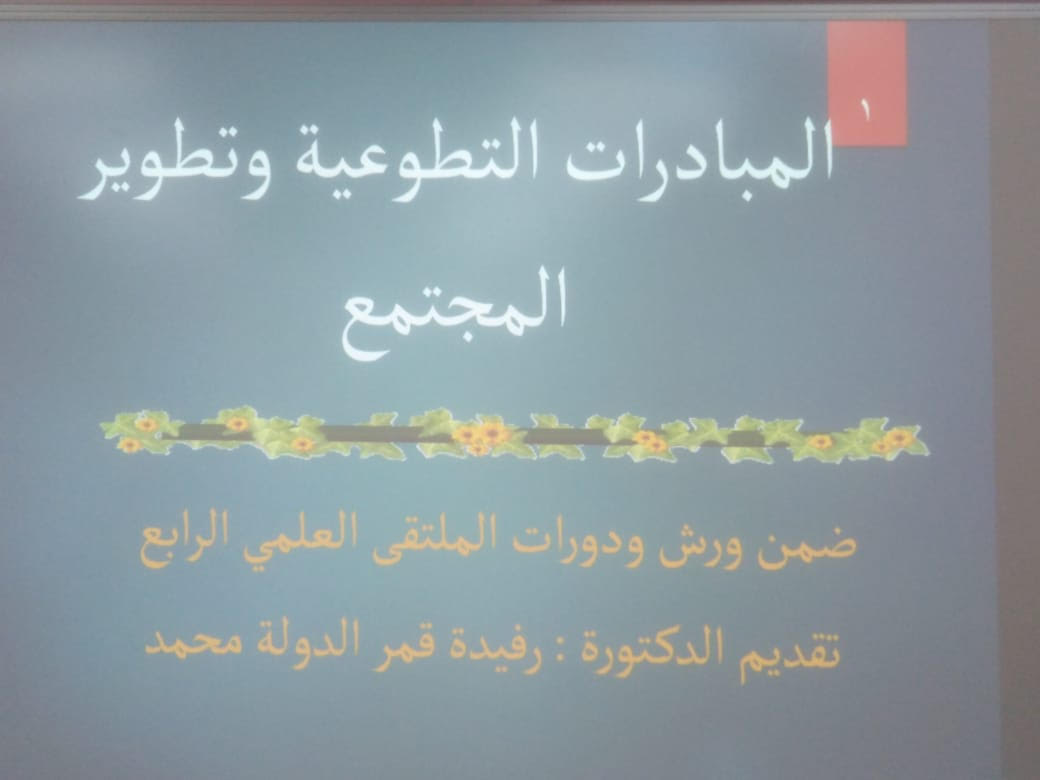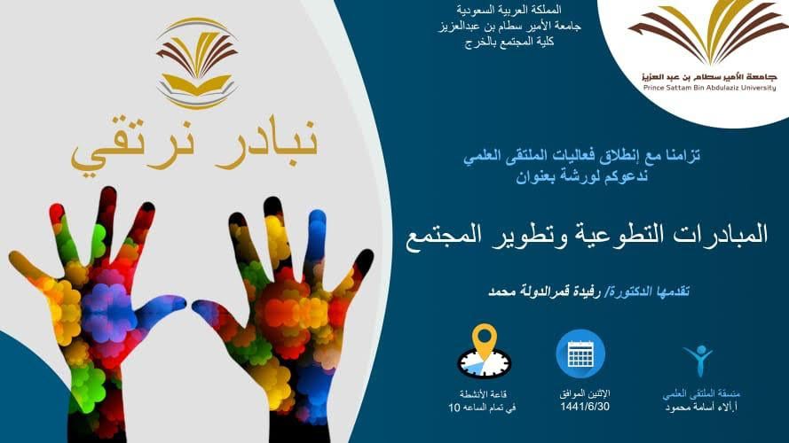 برعاية سعادة وكيلة كلية المجتمع بالخرج الدكتورة/ أمينة بنت عبد الرحمن المشحن وبإشراف من منسقة الملتقى العلمي بالكلية الأستاذة / الاء اسامه محمود . قدمت الدكتورة / رفيدة قمر الدولة محمد يوم الاثنين 30-6-1441هـ وضمن فعاليات الاستعداد للملتقى العلمي الرابع دورة تدريبية عن" المبادرات التطوعية وتطوير المجتمع" تناولت فيها أهمية العمل التطوعي والفوائد التي يجنيها المتطوع والمجتمع من العمل التطوعي ودوره في تطوير ورفعة المجتمعات مشيرة إلى ضرورة نشر ثقافة العمل التطوعي بين الاجيال والأبناء في مختلف فئاتهم العمرية وحثهم على روح العمل الجماعي وحب الخير للآخرين والتعاون. كما تناولت أنواع المتطوعين حيث ان منهم من يتطوع بفكره ومنهم من يتطوع بجاهه وماله ومتطوع بالبدن وغير ذلك من أشكال التطوع المختلفة. وقد صحبت الدورة مناقشات ومداخلات ثرية من الحضور كان لها أثر عظيم ومردود واسع على تحقيق أهداف الدورة.