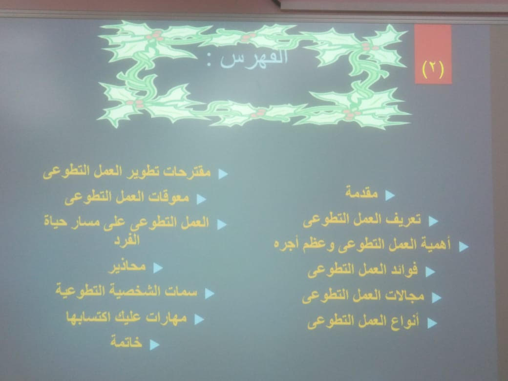 وفي ختام الدورة عرفت الدكتورة رفيدة بمجالات المشاركة في الملتقى العلمي في محور المبادرات التطوعية معرفة بكل نقطه فيها كالرياضة والمواقع الاثرية والحي المثالي و الترشيد والأسر المنتجة.