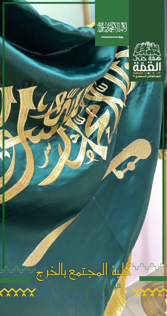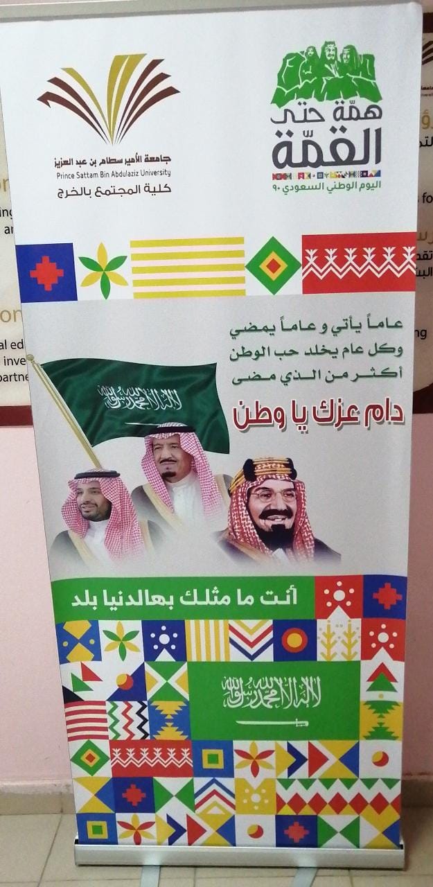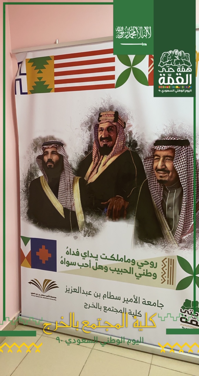 بإشراف من وحدة العلاقات العامة والإعلام بكلية المجتمع بالخرج – أقسام الطالبات – نظمت احتفالاً بالذكرى التسعين لتوحيد المملكة العربية السعودية على يد المؤسس الملك عبدالعزيز بن عبدالرحمن "طيب الله ثراه" .