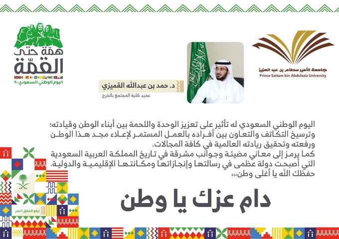 حيث أعرب سعادة عميد الكلية الدكتور/ حمد بن عبدالله القميزي ؛ عن أن اليوم الوطني السعودي له تأثير على الوحدة واللحمة بين أبناء الوطن وقيادته وترسيخ التكاتف والتعاون بين أفراده بالعمل المستمر لإعلاء مجد الوطن كما يرمز إلى معاني مضيئة وجوانب مشرقة في تاريخ المملكة العربية السعودية التي أصبحت دولة عظمى في رسالتها وانجازاتها ومكانتها الإقليمية والدولية ؛