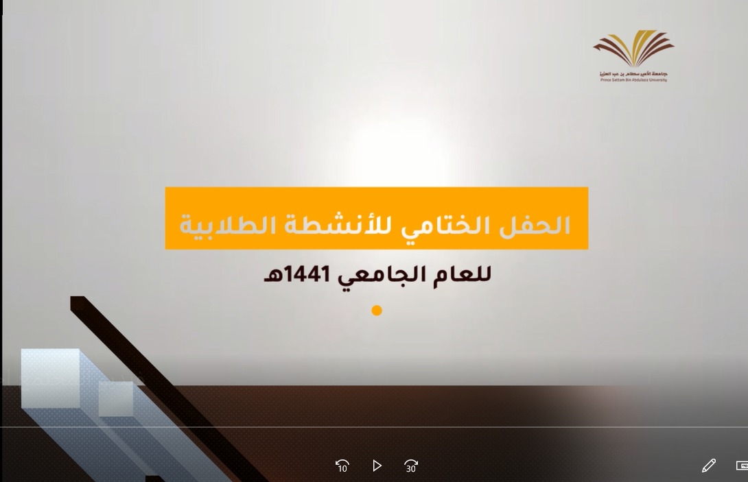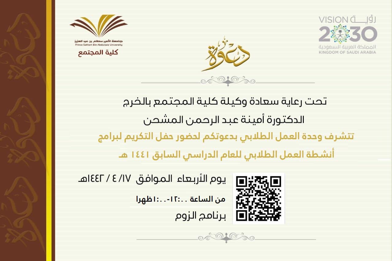 نظمت وحدة العمل الطلابي بكلية المجتمع بالخرج احتفالاً بختام الانشطة الطلابية وتميزها للعام الجامعي ١٤٤١ هـ وذلك يوم الأربعاء الموافق 17-4-1442هـ - عبر برنامج الزوم- حيث ابتدأ الحفل بآيات من الذكر الحكيم ومن ثم السلام الملكي وبعدها كلمة لسعادة وكيلة الكلية الدكتورة /أمينة بنت عبدالرحمن المشحن؛ حيث ابتدأتها بشكر الله تعالى على ما حققته الكلية من تطور ومراكز متقدمة في كآفة المجالات وخاصة في مجال الأنشطة الطلابية وتقدمت بشكرها لعماد شؤون الطلاب بالجامعة على الدعم اللامحدود الذي تقدمه للطالبات وتقدمت كذلك بشكرها لسعادة عميد كلية المجتمع بالخرج الدكتور / حمد بن عبدالله القميزي على إشرافه وحرصه ومتابعته المستمرة لجميع الأنشطة المقامة في الكلية ، كما توجهت بالشكر لمشرفة العمل الطلابي بالكلية الأستاذة /ناهد أبوزيد ؛ ولجميع أعضاء وحدة العمل الطلابي وللهيئة الإدارية بالكلية ولمشرفة العلاقات العامة والإعلام بالكلية الأستاذة نوره الدوسري على الجهود المبذولة لإبراز أنشطة الكلية وفعالياتها ولجميع طالبات الكلية على جهودهن الكبيرة والمميزة خلال العام ؛ثم تلى ذلك كلمة لمشرفة وحدة العمل الطلابي بالكلية الأستاذة/ ناهد أبوزيد ؛ تطرقت بداية إلى التعريف بالأنشطة الطلابية وأهميتها في صقل شخصية الطالبة وتنمية مهاراتها وكونها تعد مكملة للعملية التعليمية في الكلية وتحدثت عن اهتمام كلية المجتمع بالخرج بتنوع الأنشطة ومجالاتها المقدمة للطالبات وفقا بما يتناسب مع ميولهن واحتياجاتهن في شتى المجالات الثقافية والاجتماعية والتطوعية و المهارية والعلمية والعملية وغيرها واختتمت الأستاذة ناهد كلمتها بجزيل الشكر والتقدير لسعادة عميد الكلية الدكتور حمد بن عبدالله القميزي وسعادة وكيلة الكلية الدكتورة أمينة بنت عبدالرحمن المشحن على متابعتهم الحثيثة وتوجيهاتهم السديدة في دفع عجلة الانشطة بأنواعها إلى الأمام والارتقاء بكلية المجتمع ؛ومن ثم تقدمت بالشكر لأعضاء وحدة العمل الطلابي والطالبات المساندات للوحدة ؛ثم تلتها كلمة لممثلة الطالبات قدمتها الطالبة / بخيته محفوظ الدوسري .