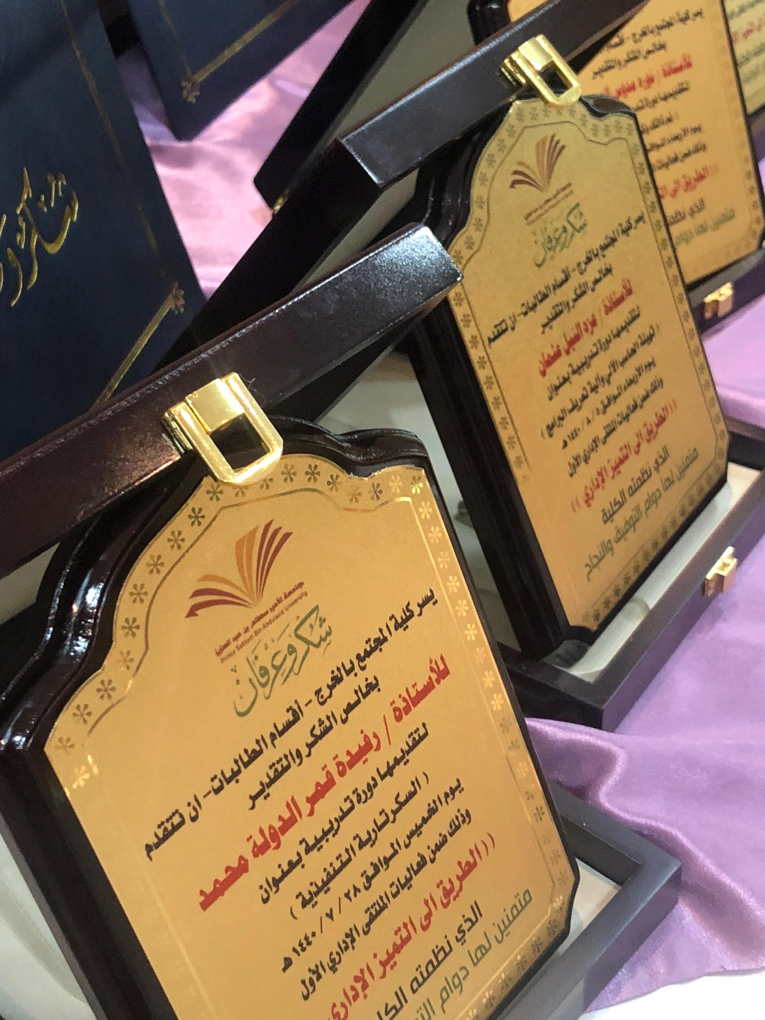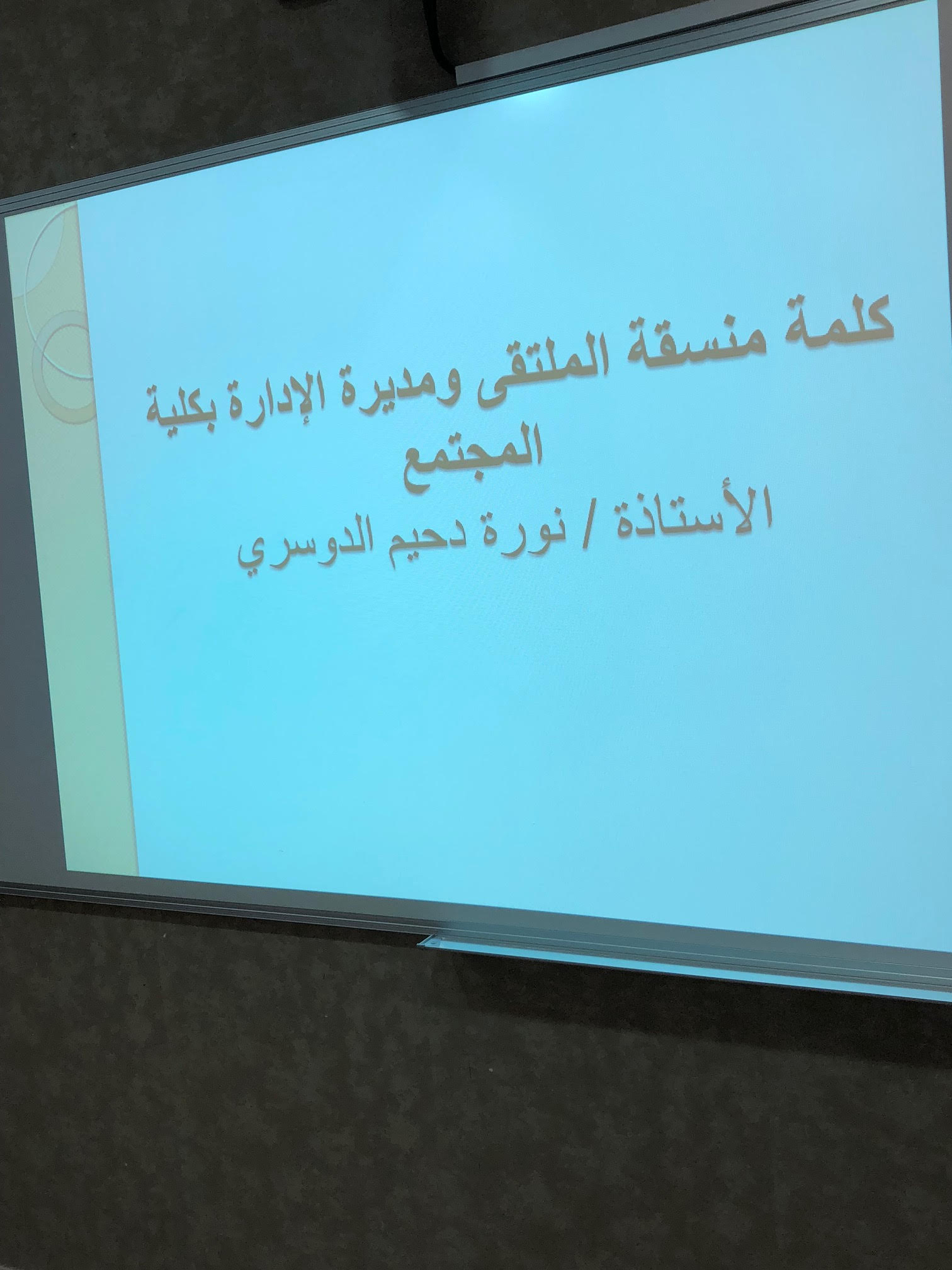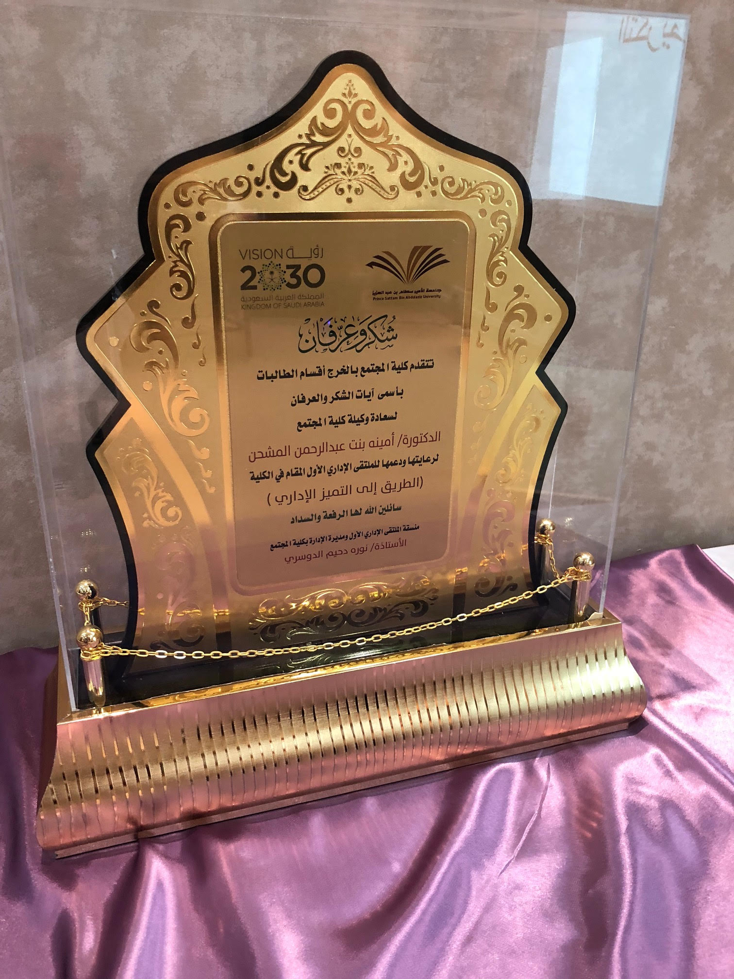 بإشراف مباشر من سعادة عميد كلية المجتمع بالخرج الدكتور/ حمد بن عبدالله القميزي، وتحت رعاية سعادة وكيلة كلية المجتمع الدكتورة / أمينة بنت عبدالرحمن المشحن .أقيم يوم الخميس الموافق6/8/1440هـ الحفل الختامي للملتقى الإداري الأول "الطريق إلى التميز الإداري" الذي نظمته الكلية خلال الفترة من 24/7/1440هـ الى 5/8/1440هـ وهو من فكرة وإعداد وتنسيق مديرة الإدارة بكلية المجتمع الأستاذة /نوره دحيم شبيب الدوسري . وقد ابتدأ الحفل بآيات من القران الكريم ثم تلاها كلمة لسعادة عميد الكلية الدكتور / حمد بن عبدالله القميزي , شكر فيها سعادة وكيلة الكلية الدكتورة أمينة المشحن على جهودها المبذولة لإنجاح الملتقى وكذلك توجه بالشكر لمديرة الإدارة بالكلية الأستاذة نوره دحيم الدوسري وكذلك جميع أعضاء هيئة التدريس والهيئة الإدارية . كما وشدد سعادته على الدور الهام للهيئة الإدارية في سير العمل بطريقة صحيحة ووضح سعادته الصفات التي يجب على الإداري الناجح ان يتحلى بها ليحقق الإبداع في عمله . تلى ذلك كلمة لسعادة وكيلة الكلية الدكتورة / امينة المشحن . شكرت فيها سعادة عميد الكلية على دعمه لجميع مناشط الكلية المختلفة وكذلك شكرت القائمين على هذا الملتقى وكذلك شكرت مديرة الإدارة في الكلية الأستاذة/ نوره الدوسري، لتنسيقها للملتقى وشكرت سعادة الدكتورة أعضاء هيئة التدريس وكذلك أعضاء الهيئة الإدارية مبينة أهمية إقامة مثل هذه الملتقيات للرقي بالعمل الإداري في أي منظمه . ثم تلى ذلك كلمة منسقة الملتقى ومديرة الإدارة في الكلية الأستاذة / نوره دحيم الدوسري . شكرت فيها سعادة عميد الكلية الدكتور حمد بن عبدالله القميزي لجهوده المبذولة لإنجاح الملتقى الإداري وكذلك توجهت بالشكر لسعادة وكيلة الكلية الدكتورة / أمينه المشحن على دعمها للملتقى وجهودها المبذولة في الملتقى منذ ان كان فكره الى ان وصل الى ملتقى اداري متميز على مستوى الجامعة استفاد منه عدد كبير من الموظفات من داخل وخارج الكلية وشهد ثناء كبير منهن على حسن التنظيم وجودة الدورات المقدمة . كما تقدمت بالشكر لأعضاء هيئة التدريس على ما قدموه من دورات تدريبية اثرت الملتقى وكذلك توجهت بالشكر لموظفات جامعة الأمير سطام بن عبدالعزيز لحضورهن الملتقى وحرصهن على الاستفادة من كل ما يقدم فيه من دورات وورش عمل . ووعدتهن بالمزيد من الفائدة والدورات والإبداع في الملتقى الإداري الثاني الذي سيقام بمشيئة الله في كلية المجتمع . تلى ذلك عرض مرئي عن الملتقى والدورات التي شهدها ثم تلى ذلك فقرة التكريم التي تم فيها تكريم أعضاء هيئة التدريس المشاركات في الملتقى وكذلك تكريم اللجان العاملة في الملتقى والمشاركات في الملتقى وتوزيع شهادات الدورات التدريبية وكذلك تكريم راعية الحفل سعادة الدكتورة / أمينة عبدالرحمن المشحن .